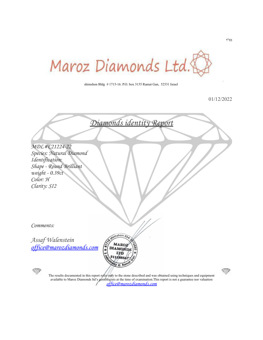 DIAMANTE NATURAL POLISHED 0,39 CARATI H - PUREZZA SI2 - TAGLIO BRILLANTE - CERTIFICATO GEMMOLOGICO MAROZ DIAMONDS LTD MEMBRO ISRAEL DIAMOND EXCHANGE - C21224-22