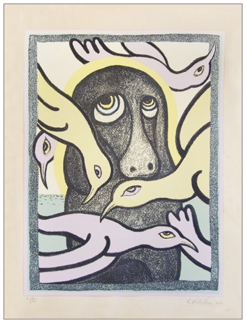 GIUSEPPE VIVIANI Agnano Pisano 1898 – Pisa 1965 Cane e uccelli 1961 Litografia a 7 colori es.88/150. Firma e data in b. a d. + timbro a secco studio dell’artista “tarde sed tuto”. (76,5 x 56,6 foglio – 64,4 x 48,3 lito) Pubbl.: “Viviani litografo” cat. a cura di Nicola Micieli e Silvio Guarasci, Bandecchi & Vivaldi Editore, Pontedera, 1988, pp.72, 124.