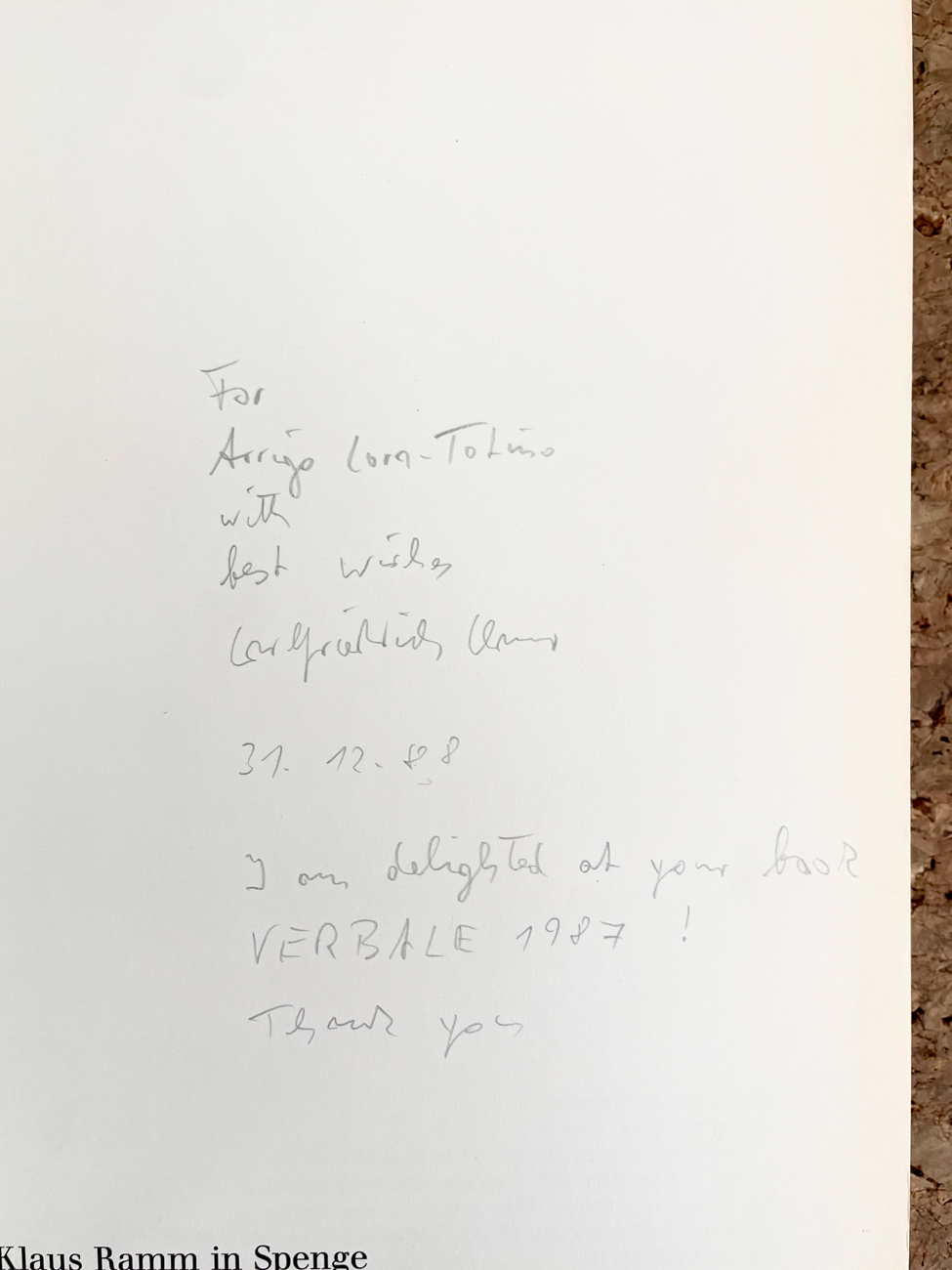 Reca dedica firmata e datata (31.12.88) da Carlfriedrich Claus ad Arrigo Lora Totino