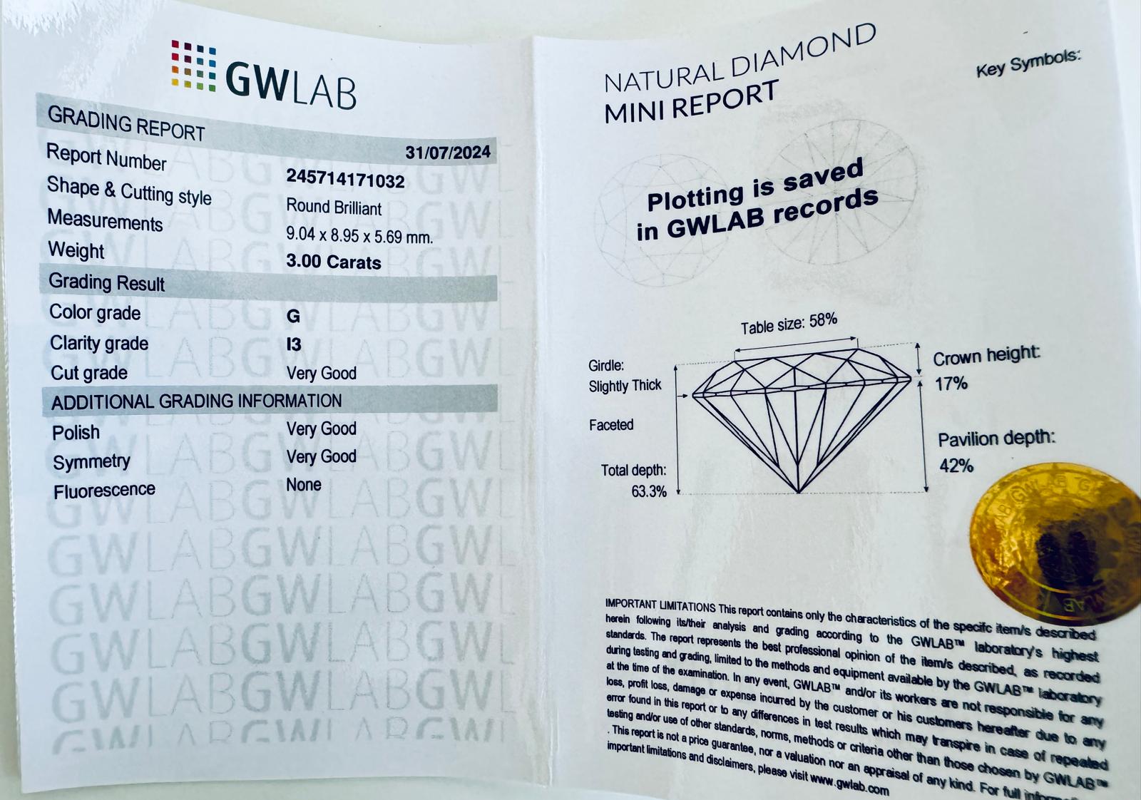 DIAMANTE NATURAL POLISHED 3 CARATI COLORE G - PUREZZA I3 - TAGLIO BRILLANTE - CERTIFICATO GW - C40705-15