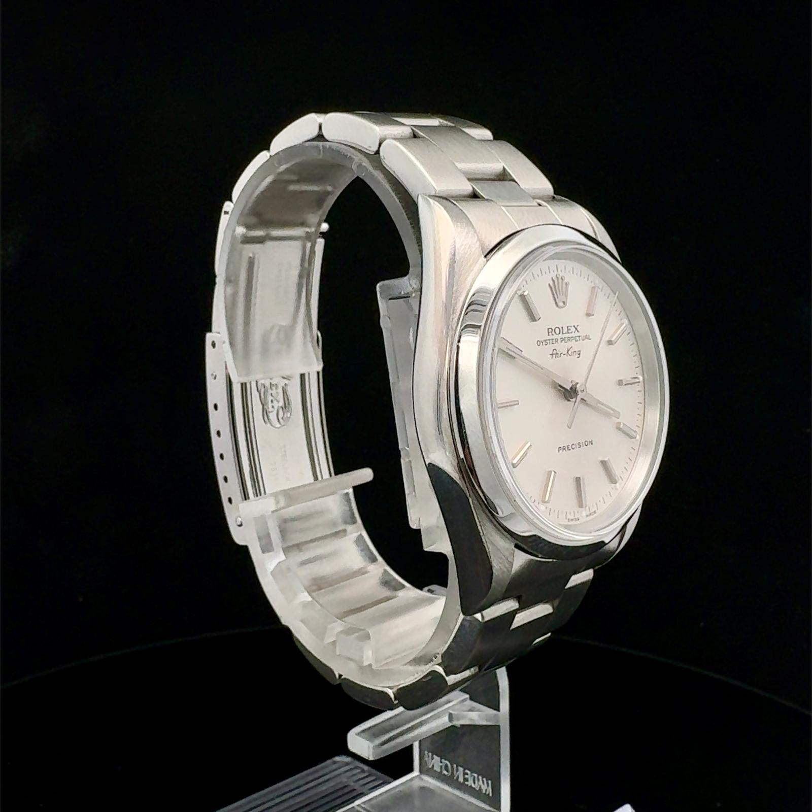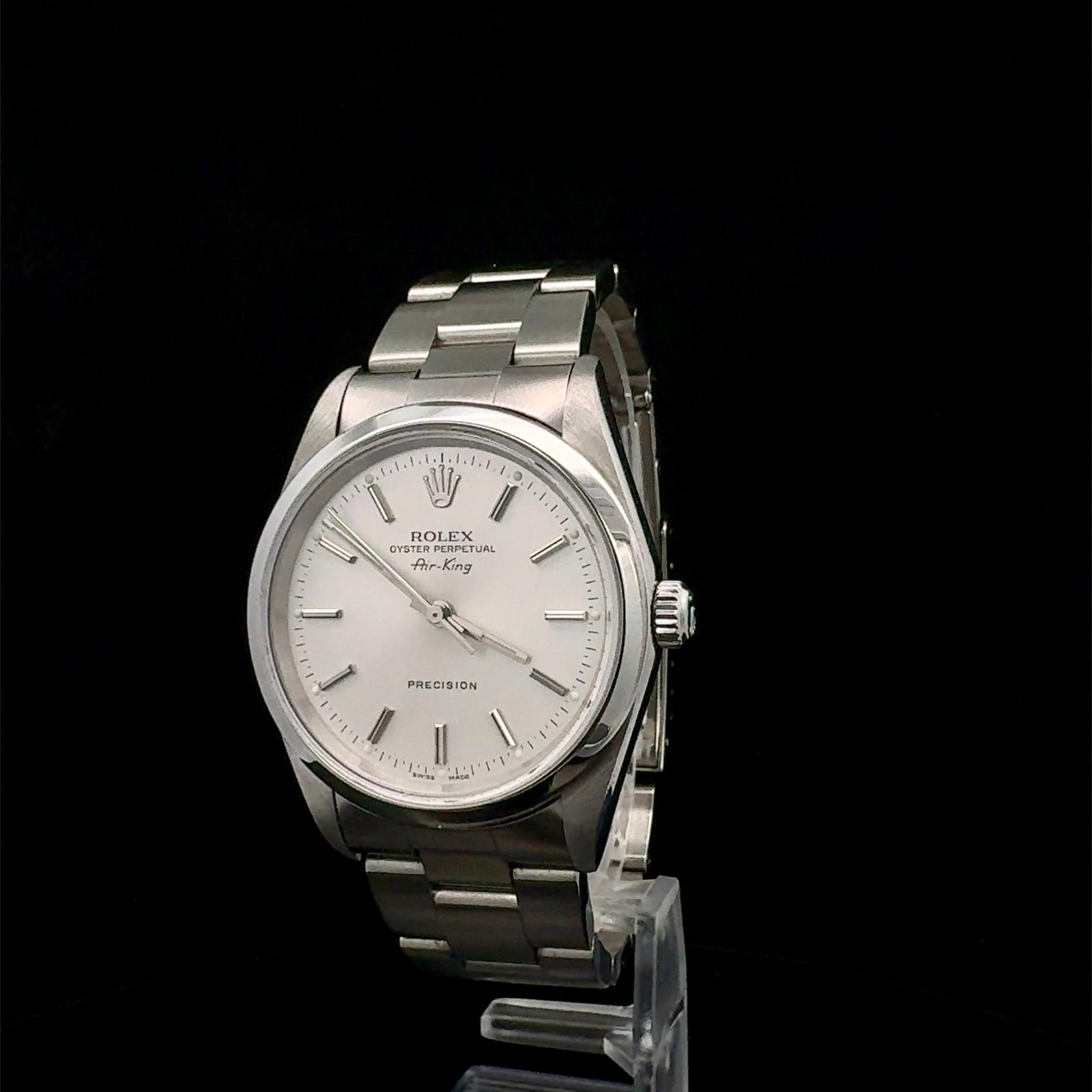 Marca Rolex Modello (Orologio) Air King Numero di referenza 14000 Carica Automatico Materiale della cassa Acciaio Anno di produzione 1999 Condizione Ottimo (di seconda mano, segni di usura assenti o appena visibili) Revisione interna documenti originali, no box Calibro Carica Automatico Cassa Materiale della cassa Acciaio Diametro 34 mm Impermeabile 10 ATM Materiale lunetta Acciaio Vetro Vetro zaffiro Numeri sul quadrante Senza numeri Cinturino Materiale cinturino Acciaio Colore cinturino Acciaio Chiusura Déployante Materiale chiusura Acciaio