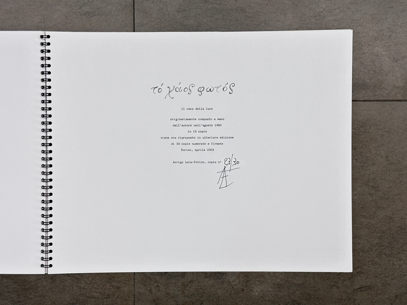 Edizione d'arte originariamente realizzata da Arrigo Lora-Totino in 15 esemplari nel 1980 ora riproposta in ulteriore edizione di 30 copie firmate e numerate (Esemplare 23/30)