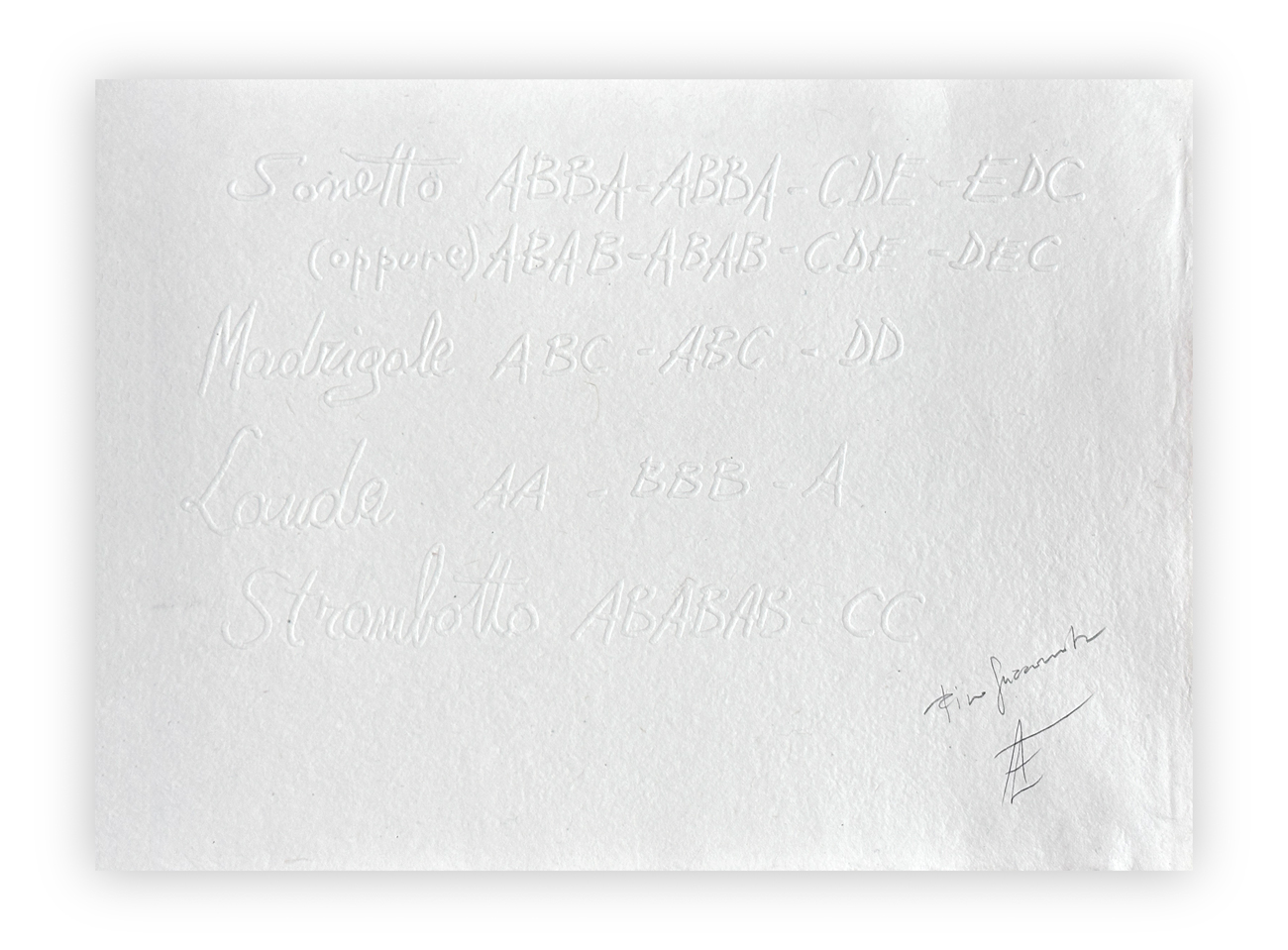 Edizione d'arte contenete un catalogo realizzato a mano, 2 multipli di Pino Guzzonato e 2 di Arrigo Lora-Totino realizzati su carta a mano firmati e numerati (Esemplari 4/7) al fronte di ciascuno