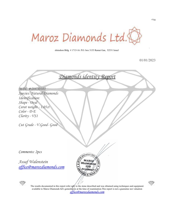 2 DIAMANTI NATURAL POLISHED 1,05 CARATI COLORE F - PUREZZA VS1 - TAGLIO OVALE - CERTIFICATO GEMMOLOGICO MAROZ DIAMONDS LTD MEMBRO ISRAEL DIAMOND EXCHANGE - DH30101