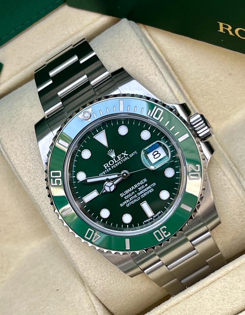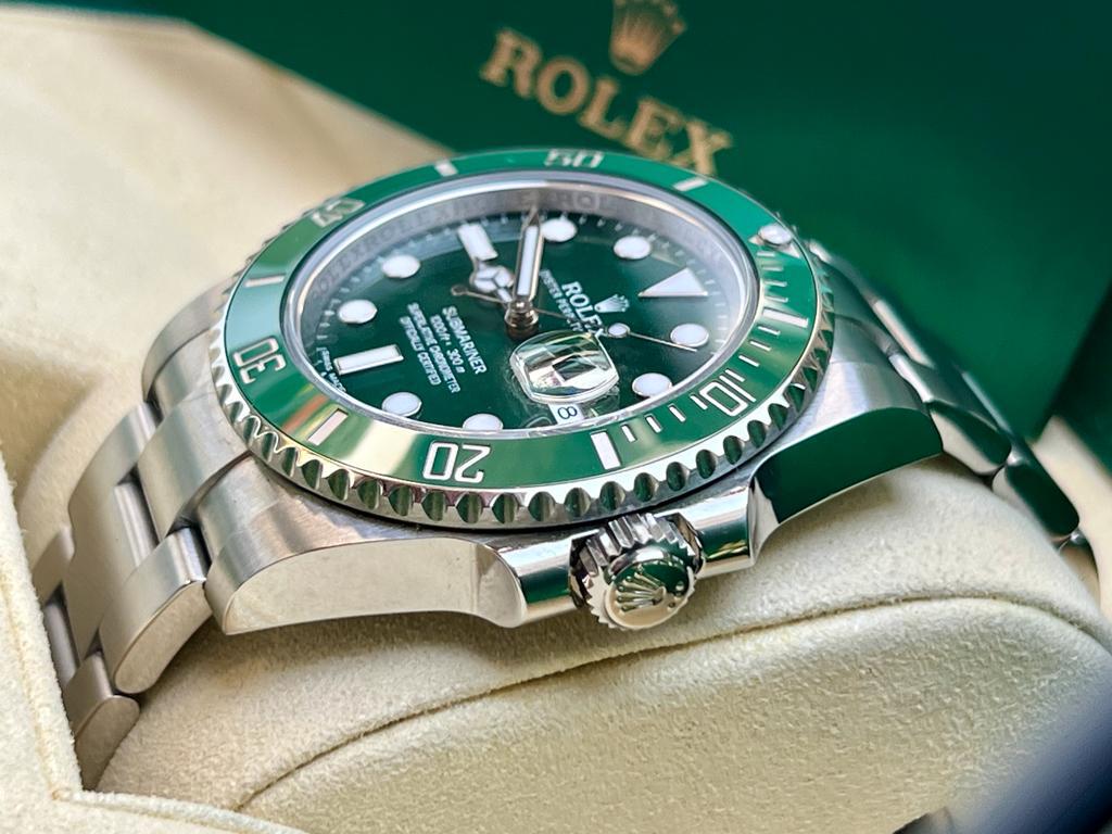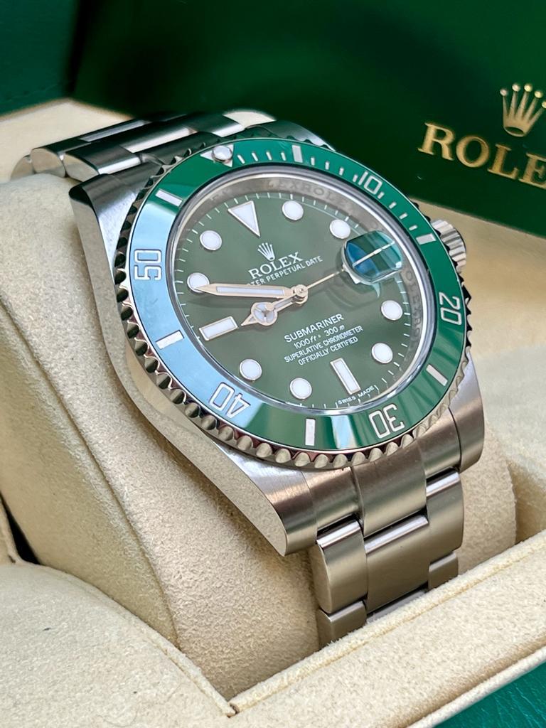 Marca Rolex Modello (Orologio) Submariner Date Numero di referenza 116610LV Carica Automatico Materiale della cassa Acciaio Materiale cinturino Acciaio Anno di produzione card bicolore Condizione Ottimo (di seconda mano, segni di usura assenti o appena visibili) Corredo documenti originali Rolex, no box la scatola utilizzata solo per fotografie non è in vendita Carica Automatico Cassa Materiale della cassa Acciaio Diametro 40 mm Impermeabile 30 ATM Materiale lunetta Ceramica Vetro Vetro zaffiro Quadrante Nero Numeri sul quadrante Senza numeri Cinturino Materiale cinturino Acciaio Colore cinturino Acciaio Chiusura Déployante Materiale chiusura Acciaio Funzioni Data Altro Secondi centrali, Corona a vite