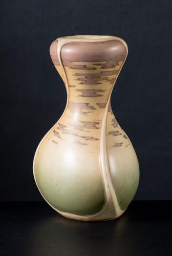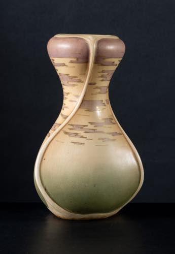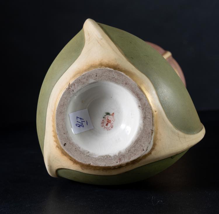 Vaso di forma affusolata in porcellana opaca policroma nei toni degradanti dal color biscotto, al verde, al rosa purpureo.