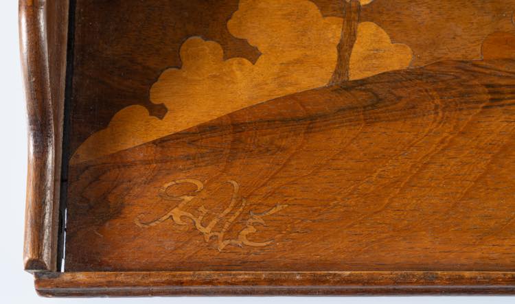 Con intarsi in legno di frutto che disegnano un paesaggio con alberi e colline. Firmato Gallé.