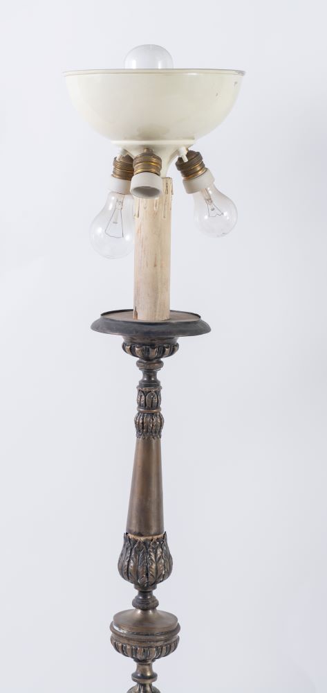 Base a sezione triangolare con piedi a voluta decorata con elementi vegetali a volute; fusto a balaustro decorato con foglie stilizzate, con nodo a vaso baccellato, bocciolo baccellato, piattello e puntale, ambito laziale, XIX secolo.