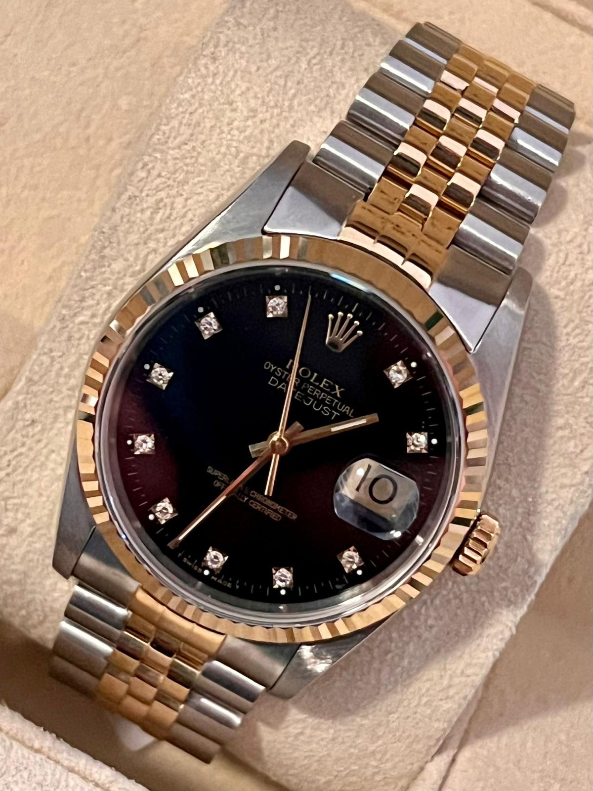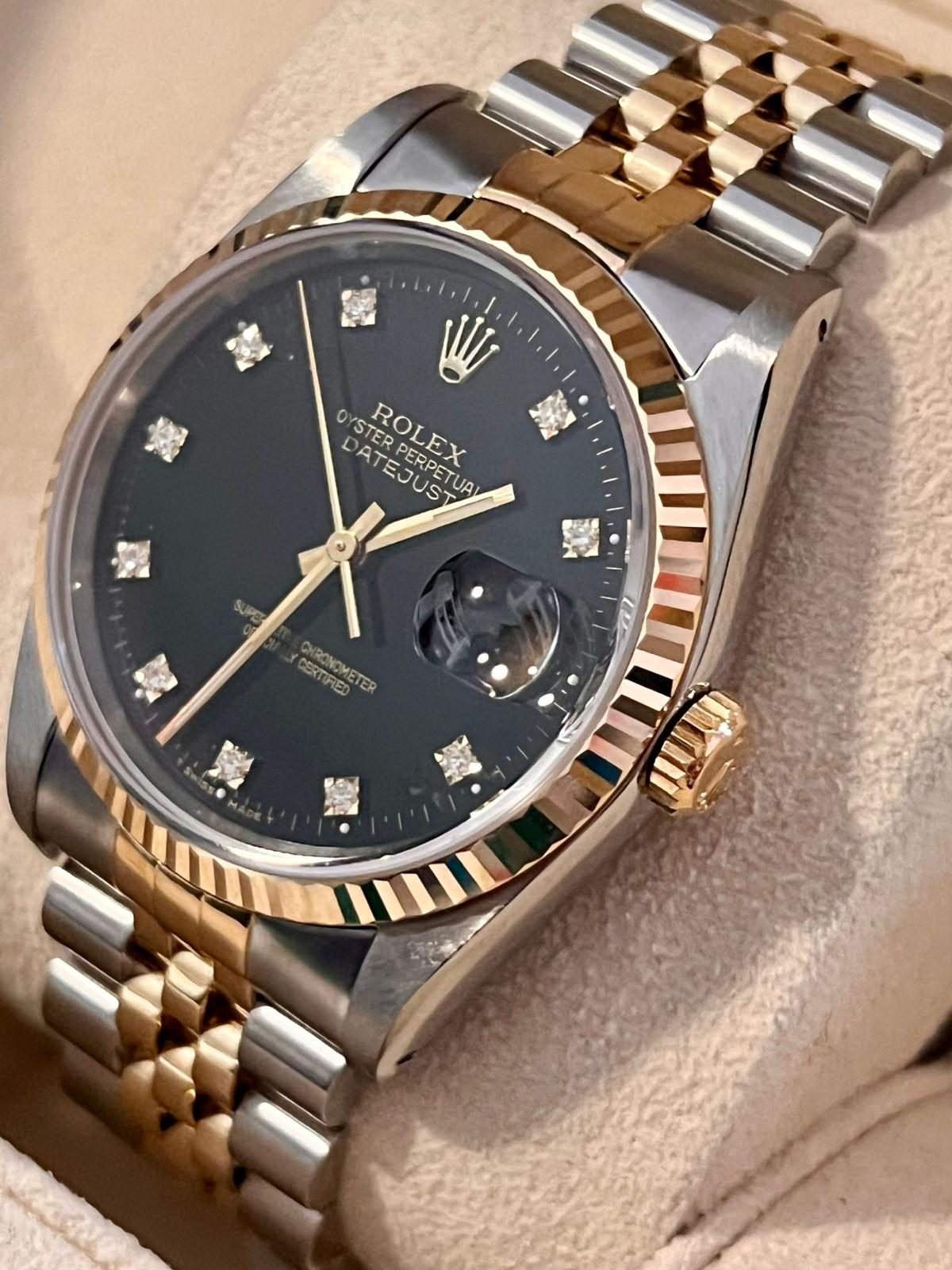 Marca Rolex Modello (Orologio) Datejust 36 Numero di referenza 16233 Carica Automatico Materiale della cassa Oro/Acciaio Materiale cinturino Oro/acciaio Anni 90 Condizione Usato (Ottimo) L'articolo presenta segni di usura lievi, come ad esempio graffi leggeri, ma non percepibili al tatto. Corredo Con documenti originali, no box la scatola utilizzata solo per fotografie non in vendita Diametro 36 mm Impermeabile 10 ATM Materiale lunetta Oro giallo Vetro Vetro zaffiro Cinturino Materiale cinturino Oro/acciaio Colore cinturino Oro/acciaio Chiusura Déployante Materiale chiusura Acciaio