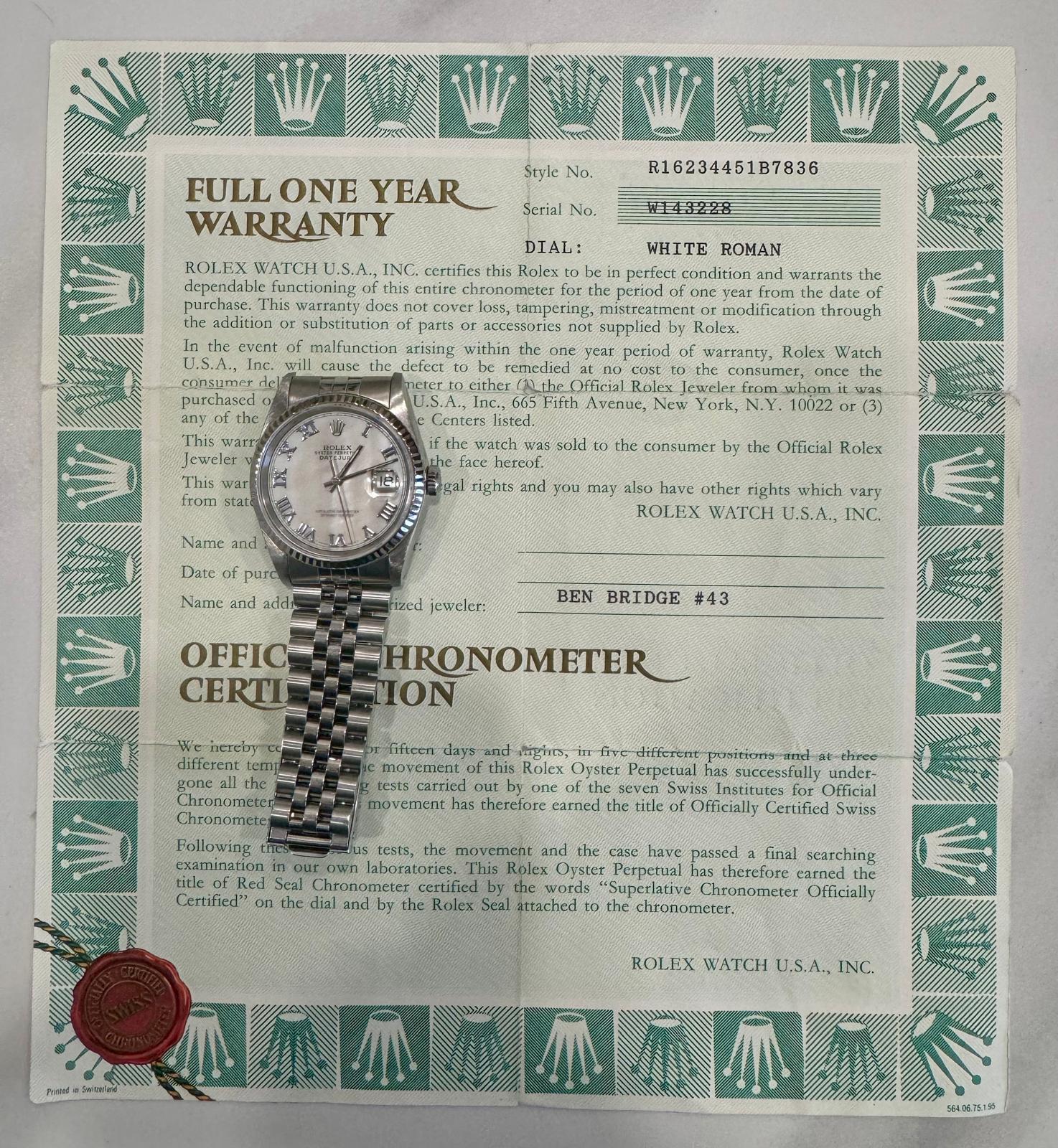 Marca Rolex Modello (Orologio) Datejust 36 Numero di referenza 16234 Carica Automatico Materiale della cassa Acciaio Materiale cinturino Acciaio Anno di produzione 1995 Condizione Ottimo (di seconda mano, segni di usura assenti o appena visibili) documenti originali, no box Carica Automatico Materiale della cassa Acciaio Diametro 36 mm Impermeabile 10 ATM Materiale lunetta Oro bianco Vetro Vetro zaffiro Cinturino Materiale cinturino Acciaio Colore cinturino Acciaio Chiusura Déployante Materiale chiusura Acciaio, quadrante madreperla aftermarket