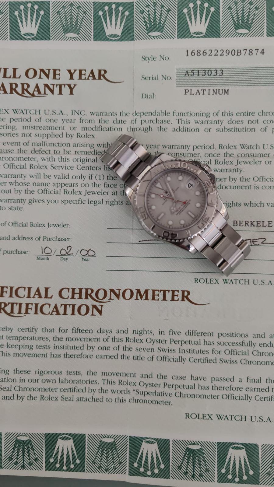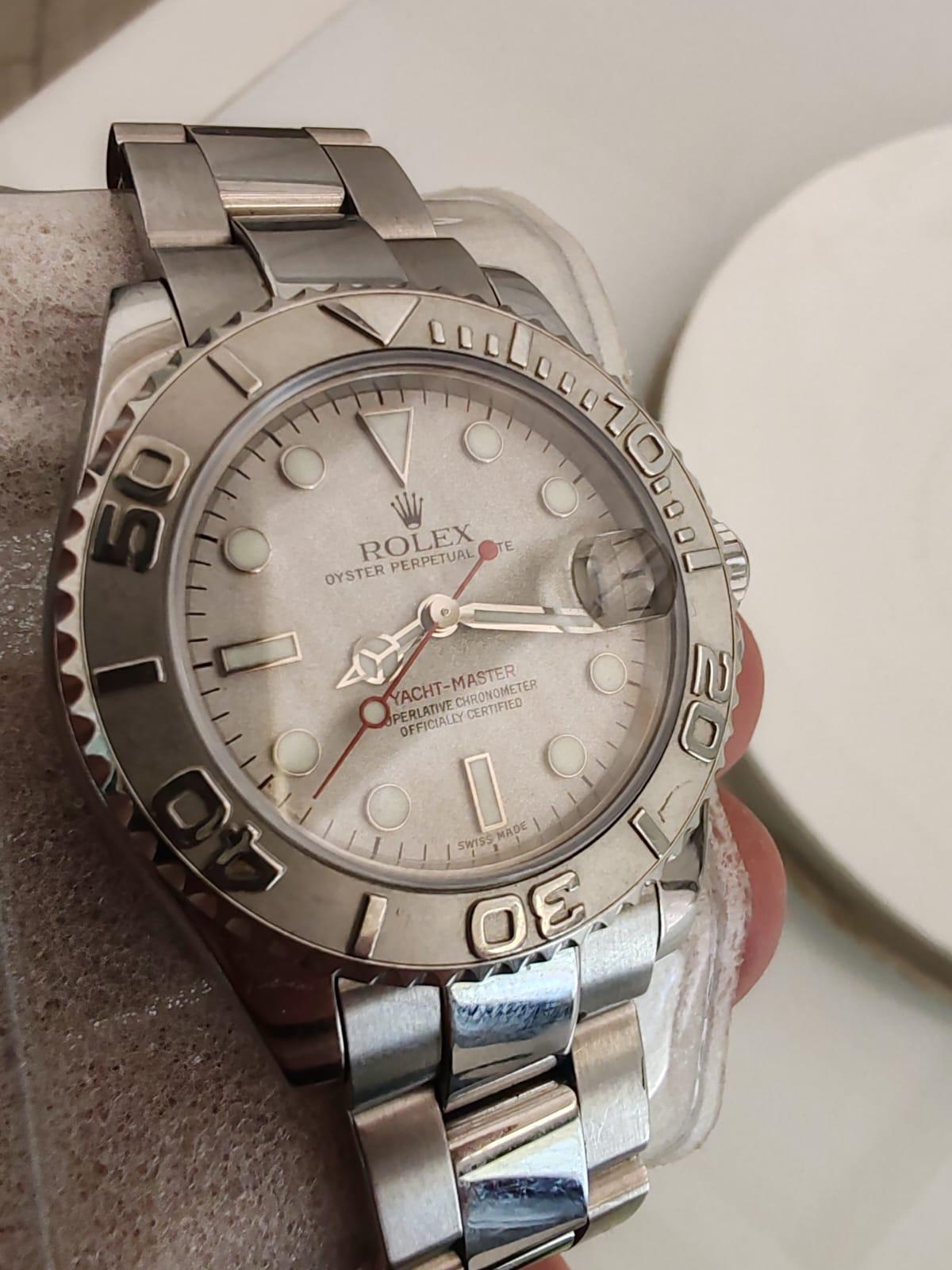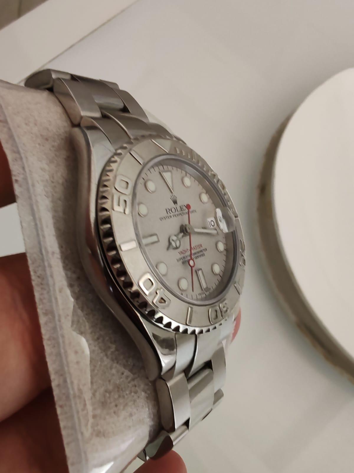Marca Rolex Modello (Orologio) Yacht-Master Numero di referenza 168622 Carica Automatico Materiale della cassa Acciaio Materiale cinturino Acciaio Anno di produzione 2000 documenti originali, no box Materiale della cassa Acciaio Diametro 35 mm Materiale lunetta Platino Vetro Vetro zaffiro Quadrante Argento Numeri sul quadrante Senza numeri Cinturino Materiale cinturino Acciaio Colore cinturino Acciaio Chiusura Déployante Materiale chiusura Acciaio