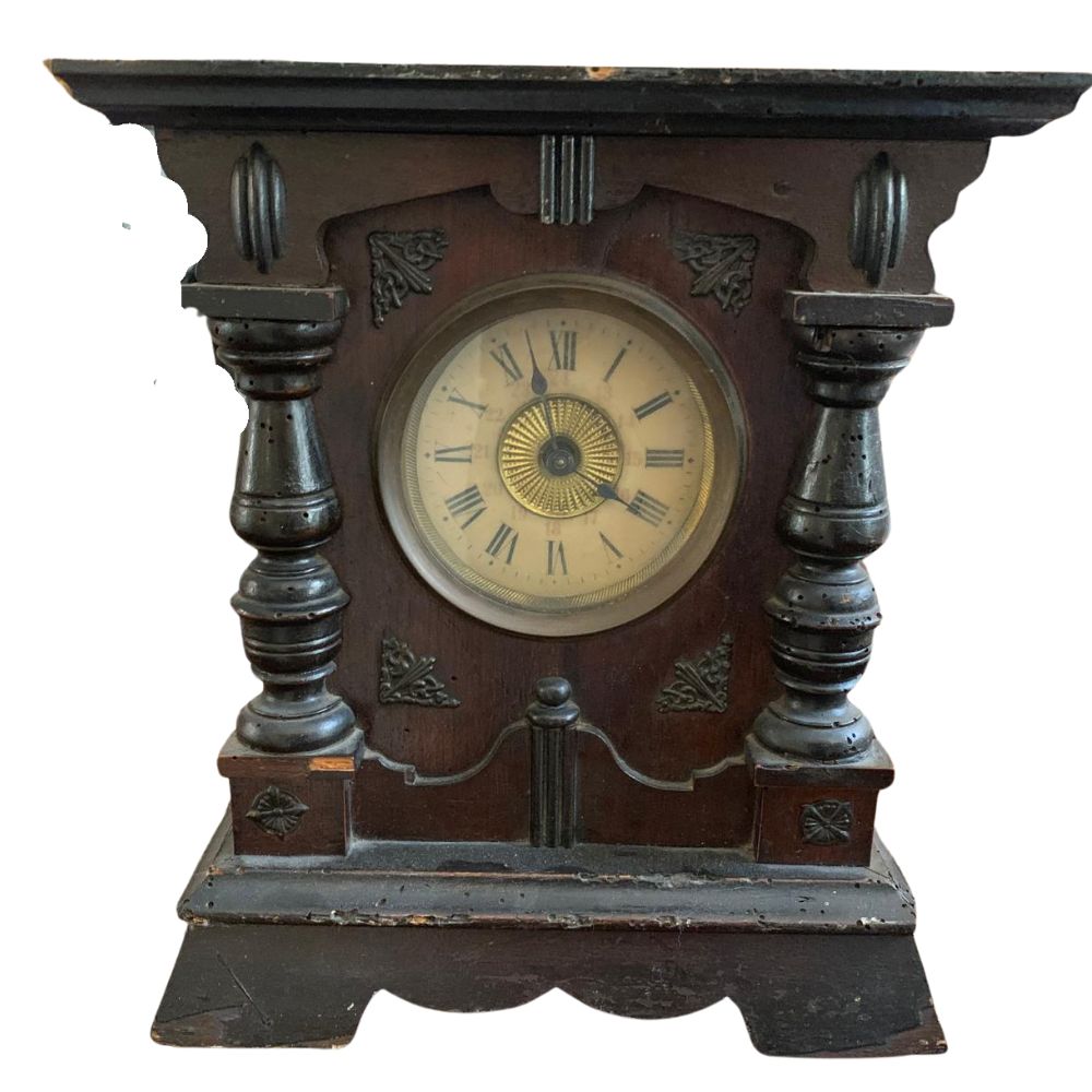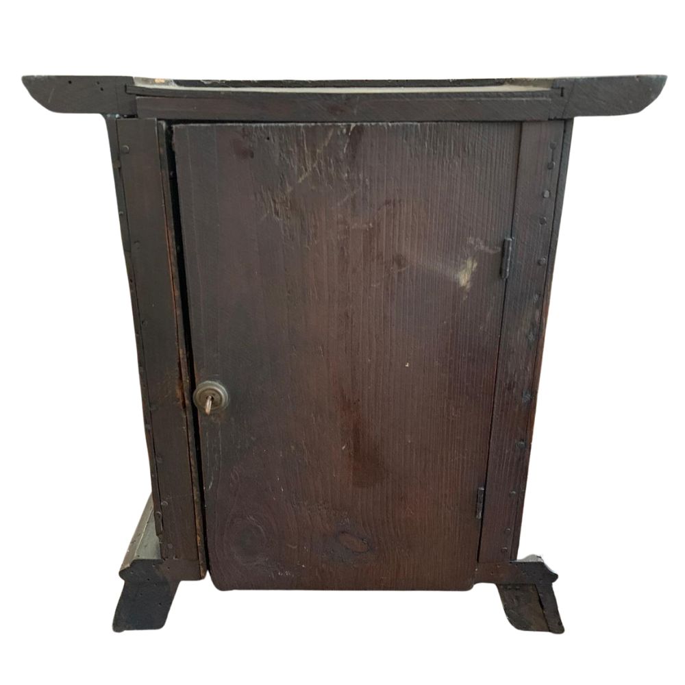 Il meccanismo è del tipo bilancere. Sul retro un piccolo sportello consente di aprire il vano del meccanismo per la carica delle molle, l'impostazione della sveglia e la messa in orario dell'orologio. Cassa in legno con elementi bronzo. Antica etichetta non leggibile sulla parte interna dello sportellino posteriore.