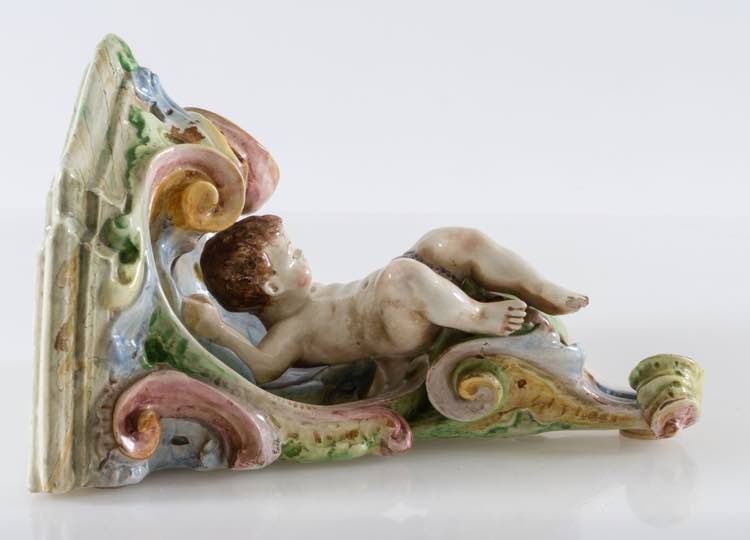 Salvini. Mensola in maiolica policroma invetriata con putto. Seconda metà del XIX e inizi del XX secolo.