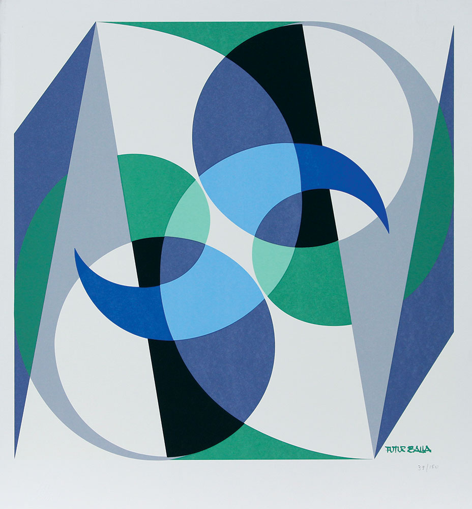 Balla Giacomo Equilibrio spaziale serigrafia su carta Fabriano, cm. 74x70, es. 39/150 timbro a secco Balla Futurista in basso a sinistra e Serigrafia dall'Originale Futurballa in basso a destra, firmata Futurballa in lastra, dichiarazione di garanzia di Luce Balla senza cornice
