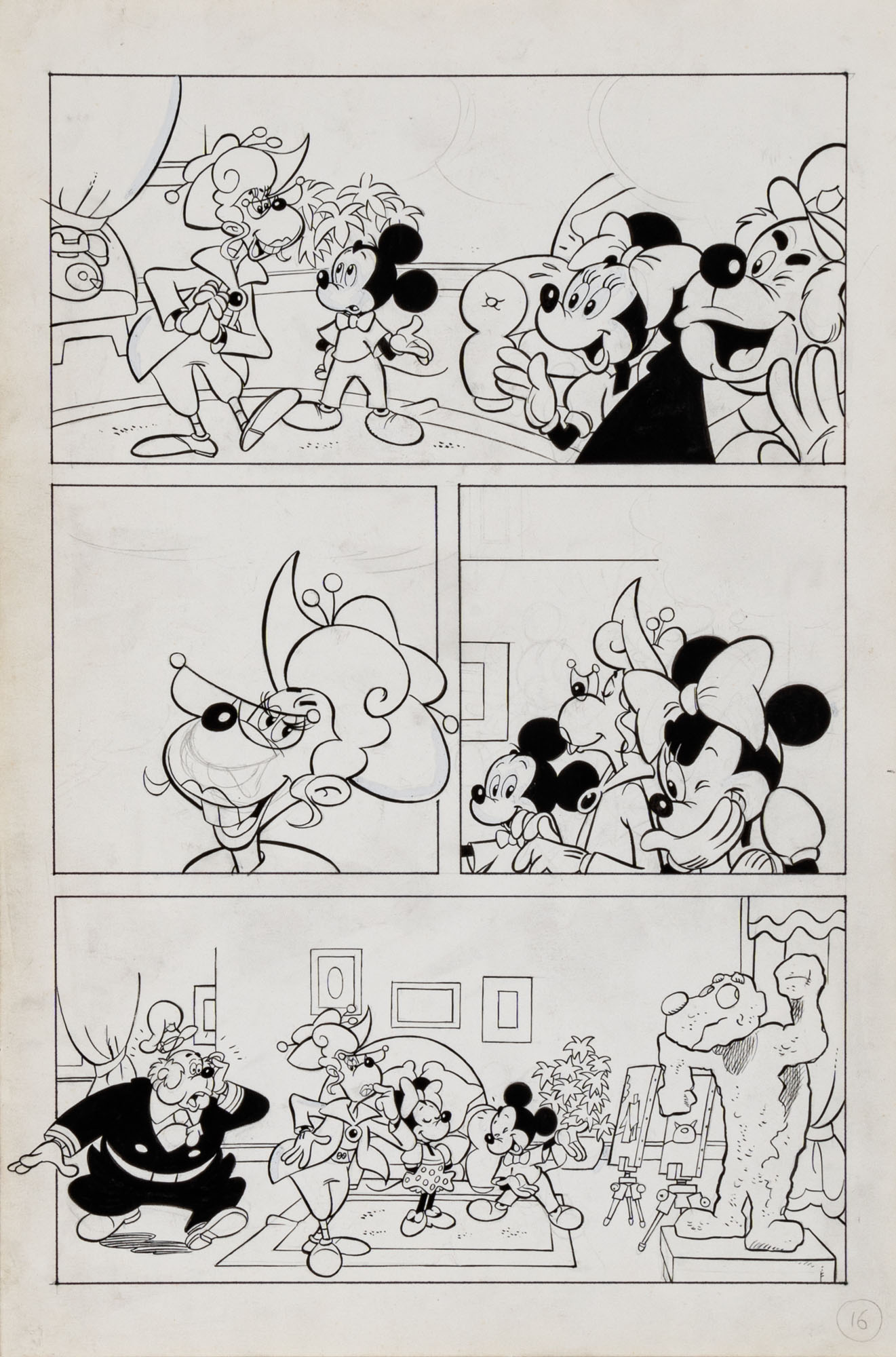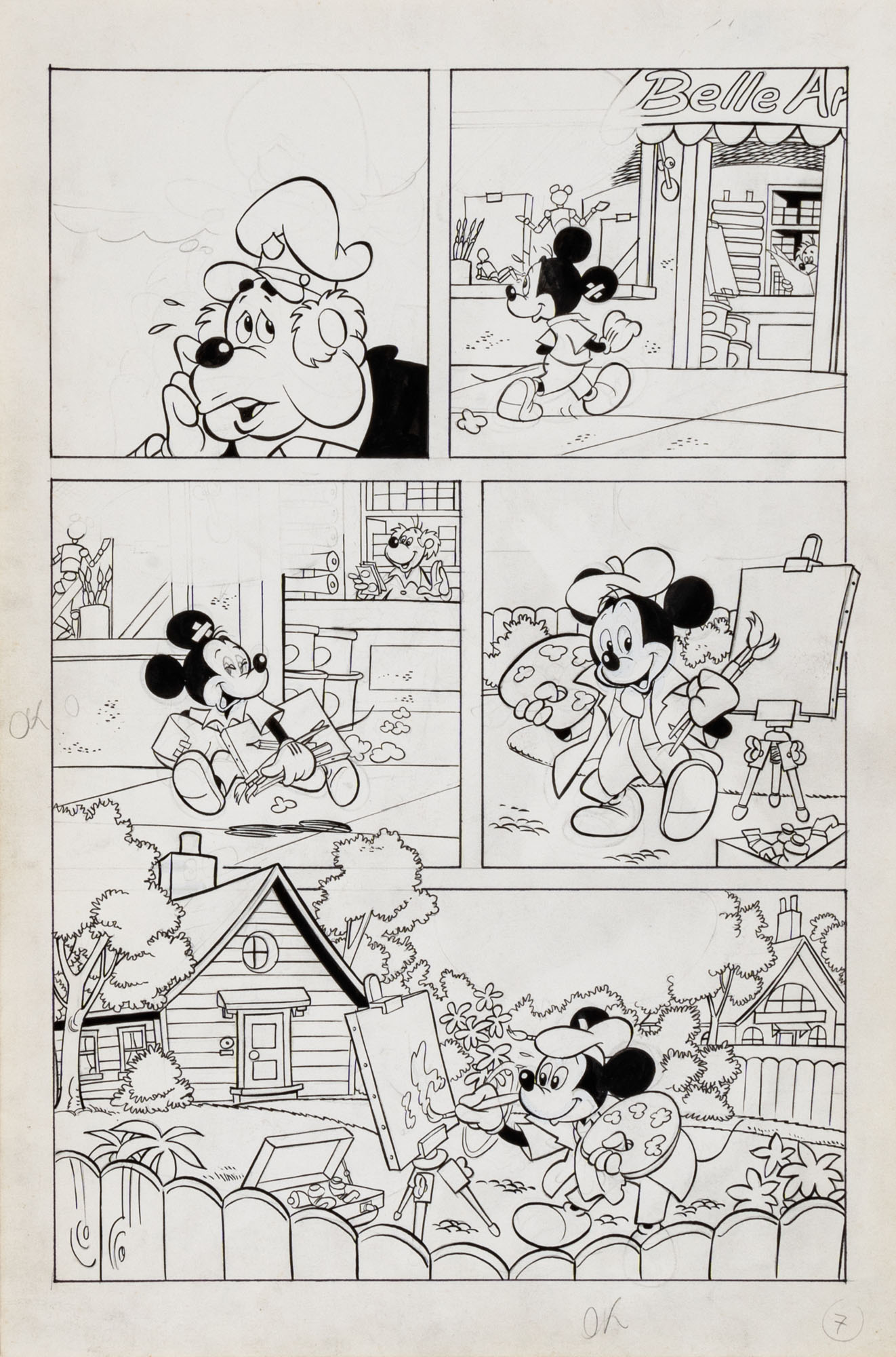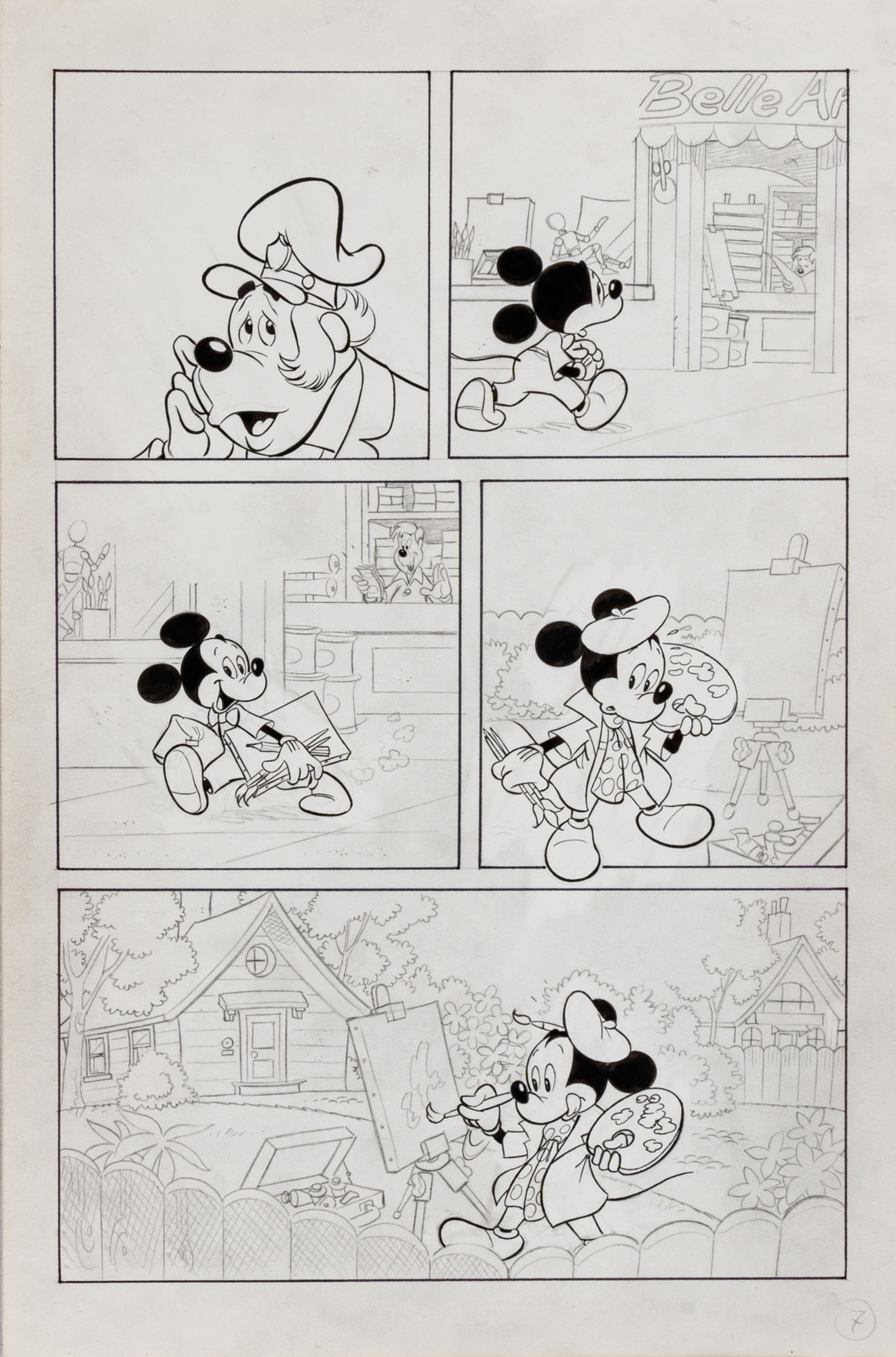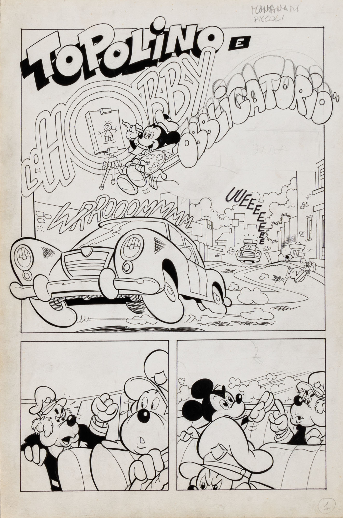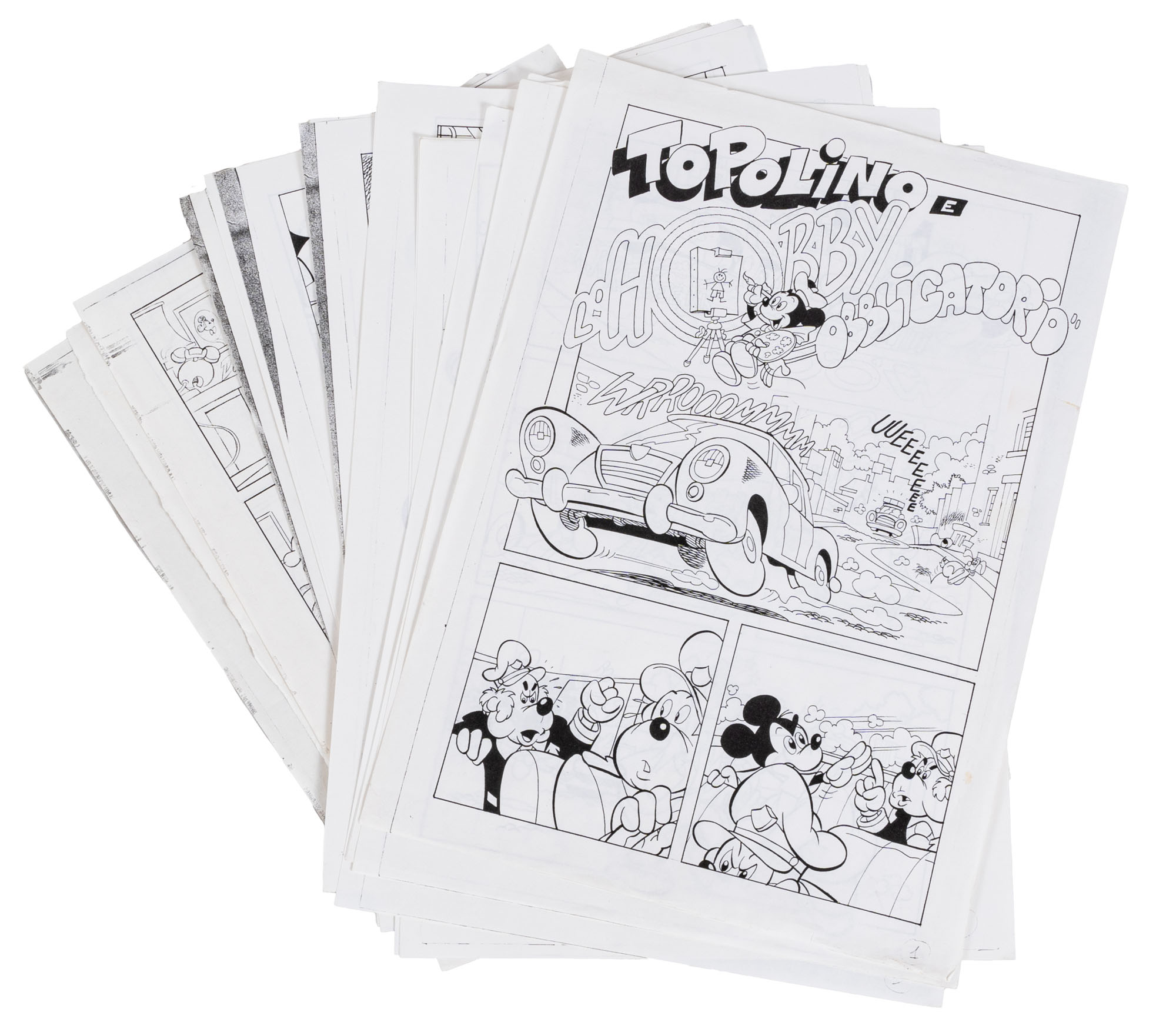 MONTANARI GIUSEPPE, PICCOLI CLAUDIOTopolino e l'hobby obbligatorio, storia inedita in 40 tavole1993China su cartaOgni tavola misura 36 x 24 cmLa tavola n. 4 è mancante, numerose pagine alternative e 27 prove di stampaQuesta storia risulta inedita in quanto pubblicata su Topolino libretto 1938, ma disegnata da Sandro Del Conte