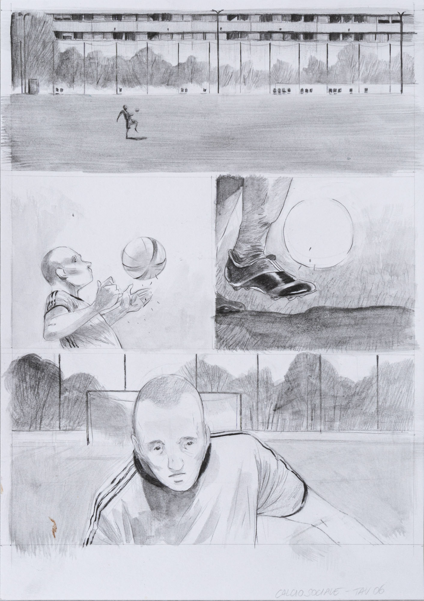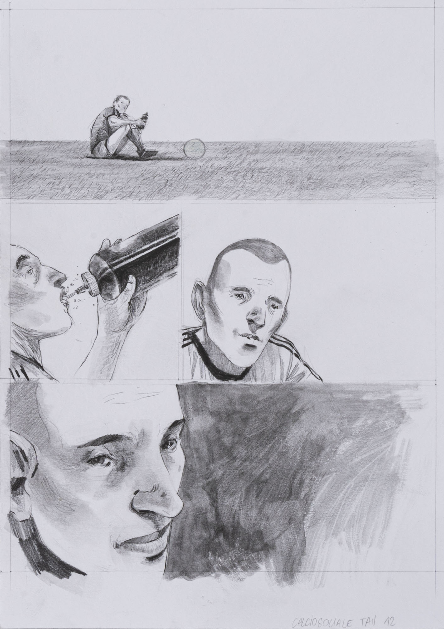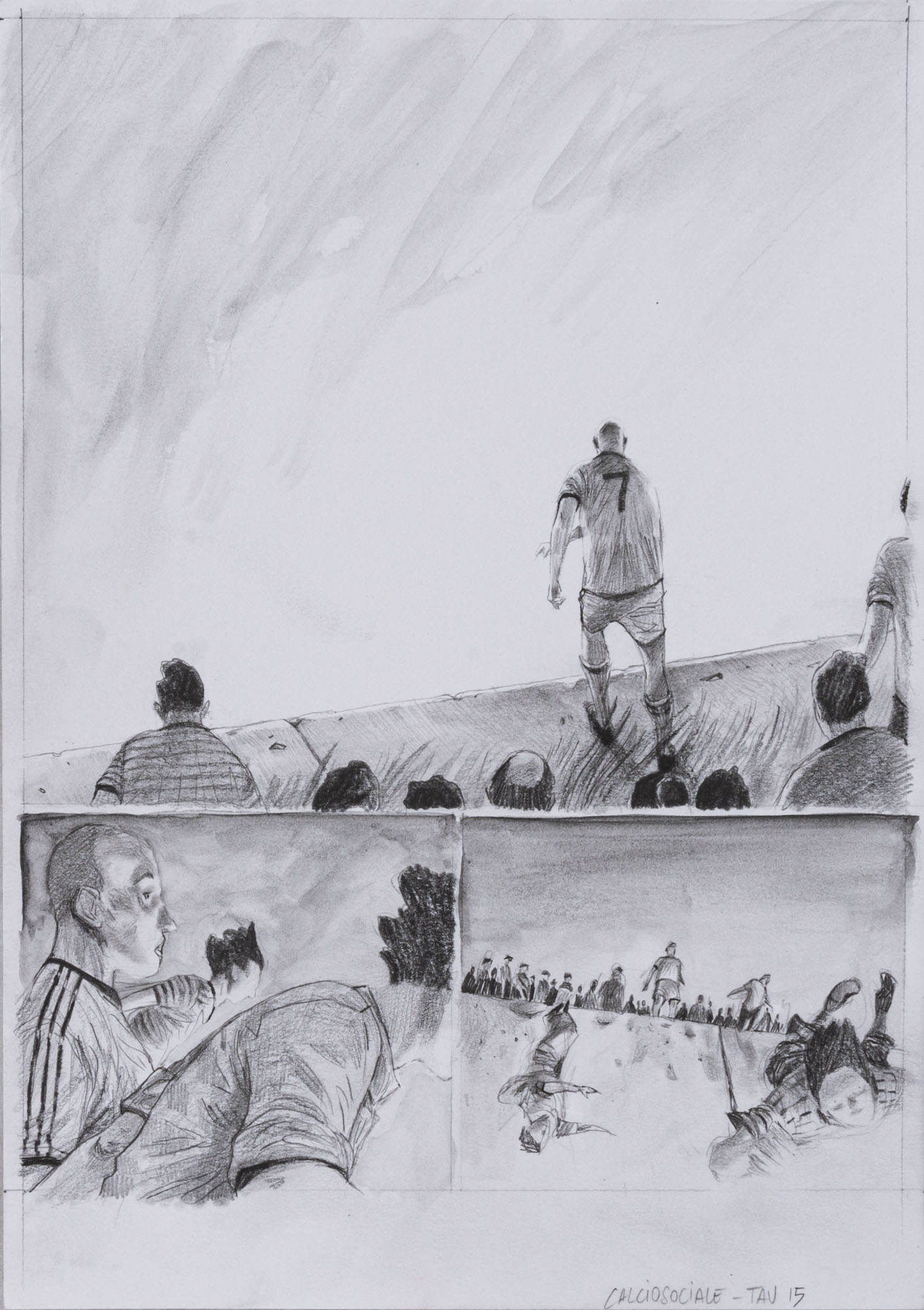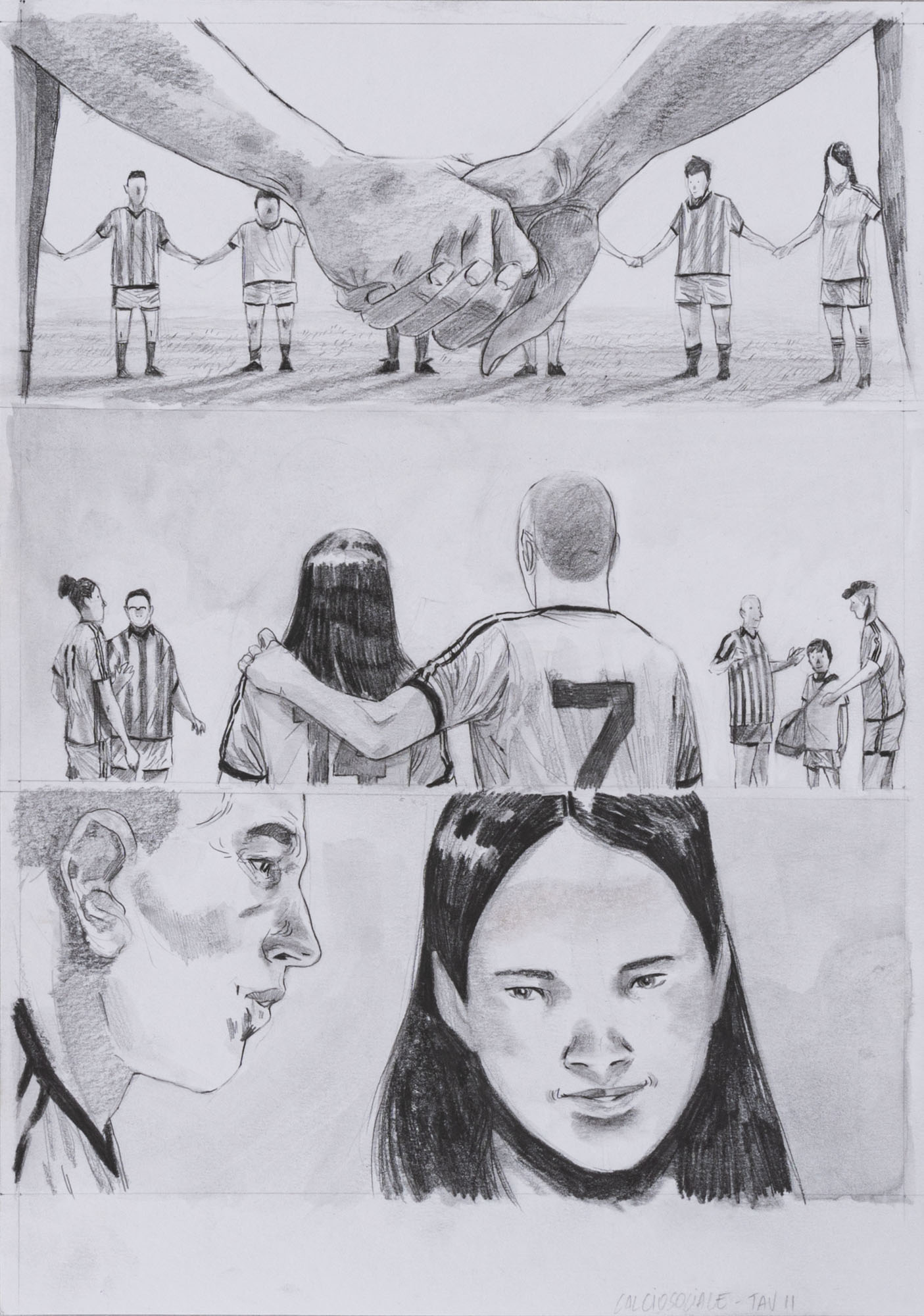 PAOLO CASTALDI(1982)Calcio Sociale, storia completa in 23 pagine con copertina2022Matita, grafite acquerellabile e pastello a olio su cartaOgni tavola misura 29,5 x 21 cmTesti di Francesca Mannocchi, pubblicato per il n. 1 de La Revue Dessinéè Italia