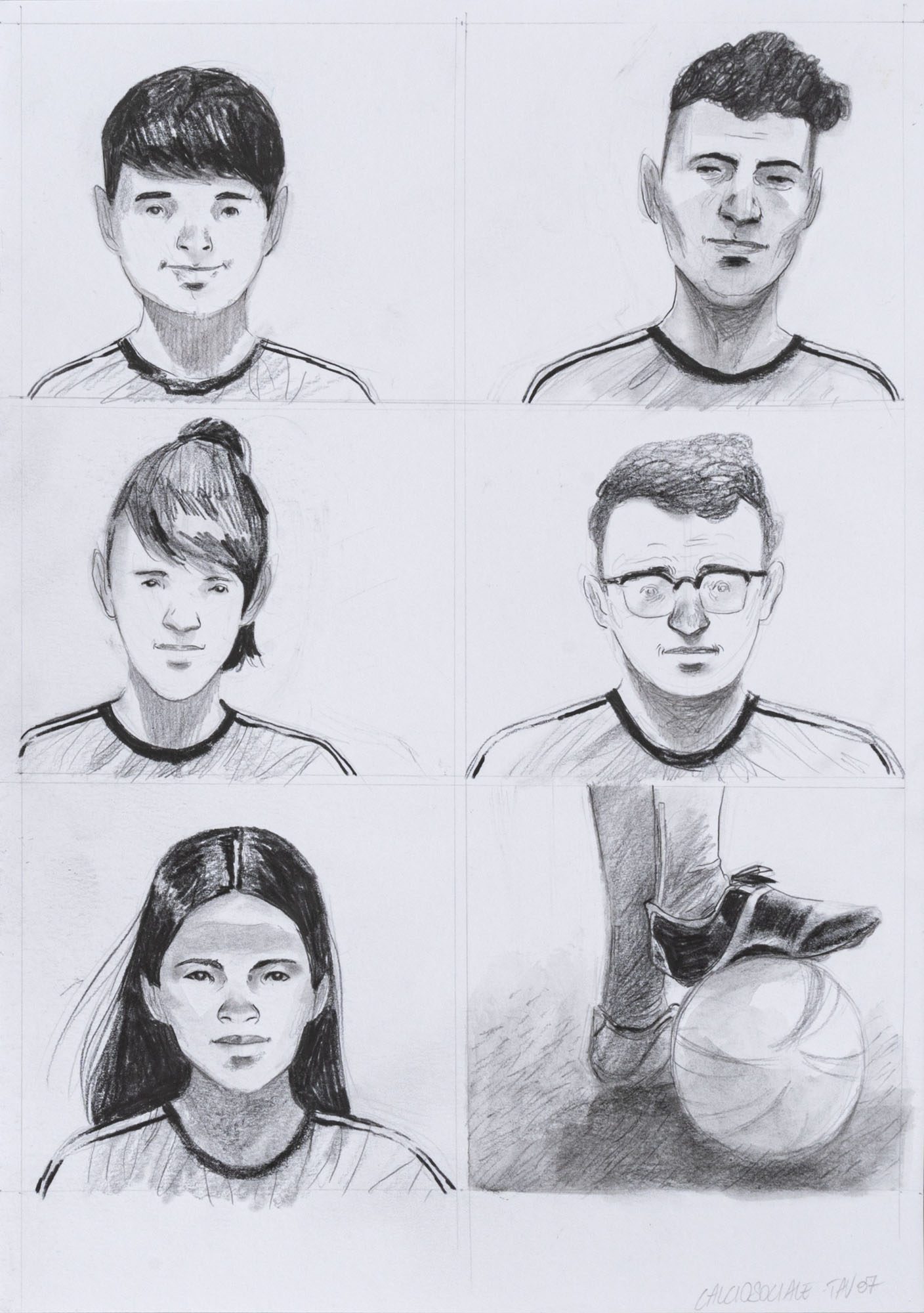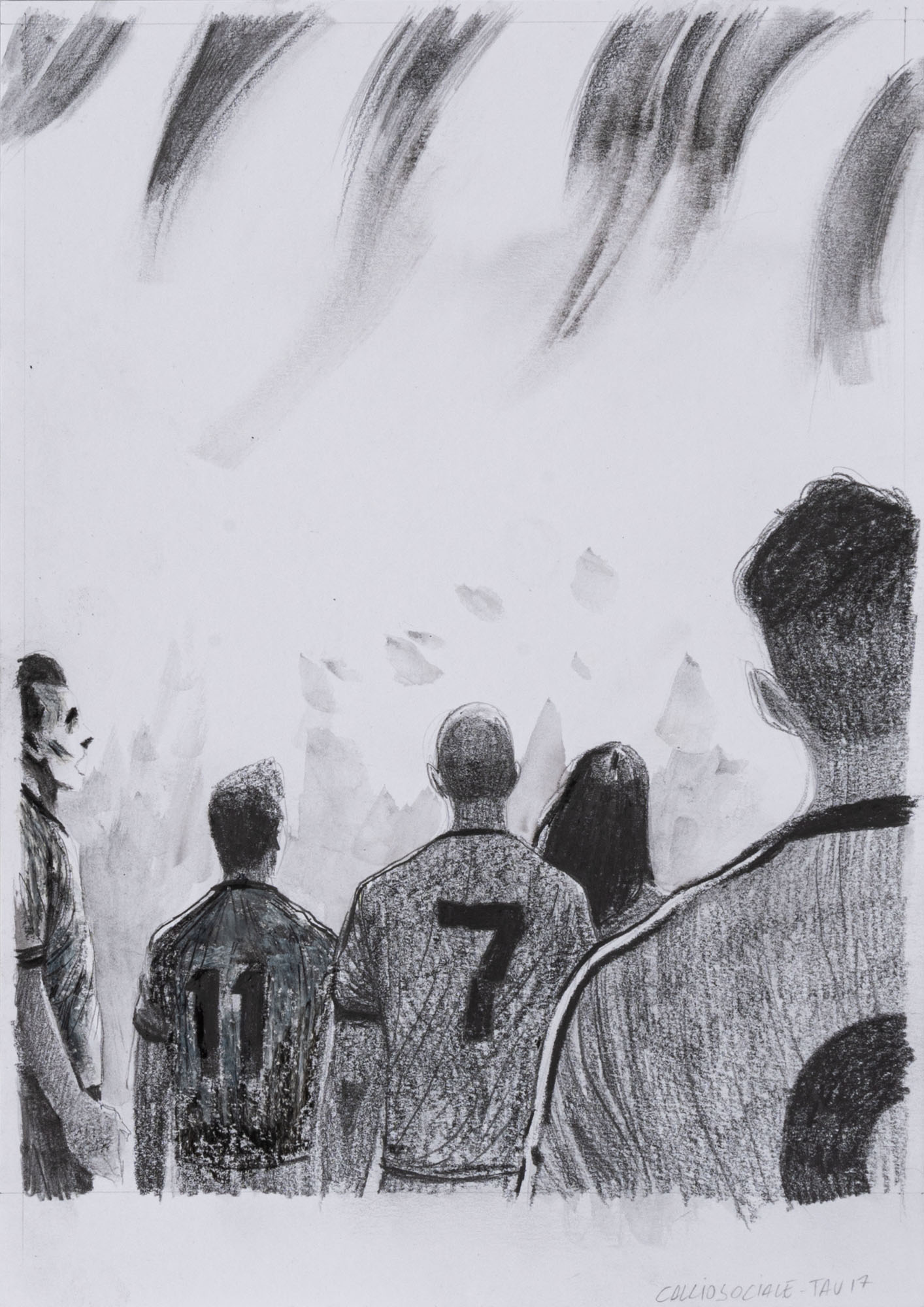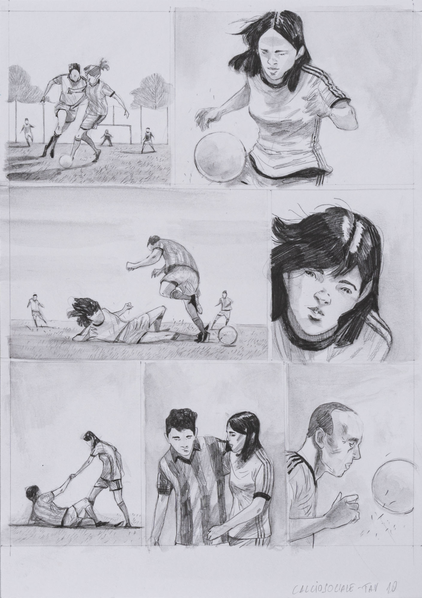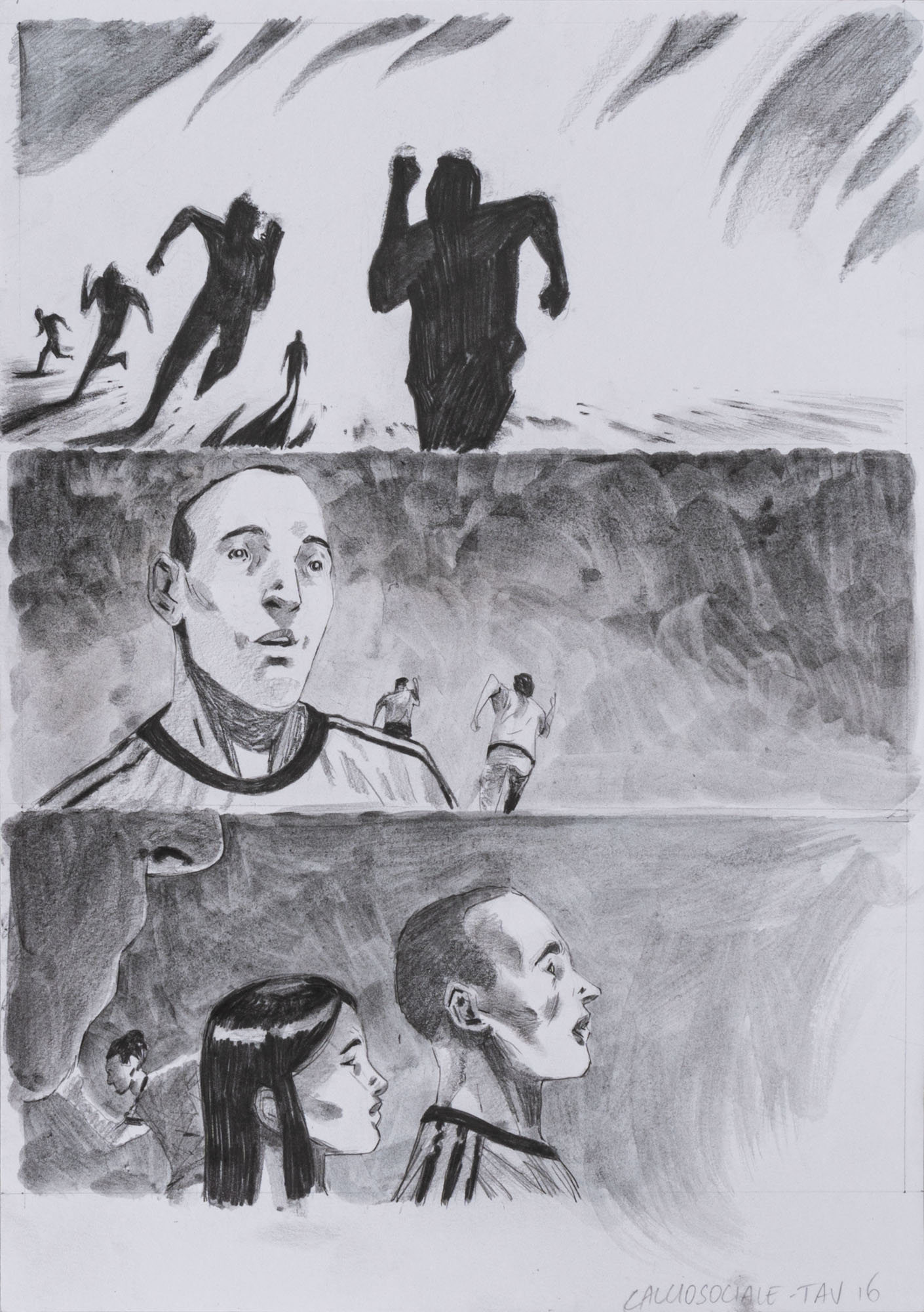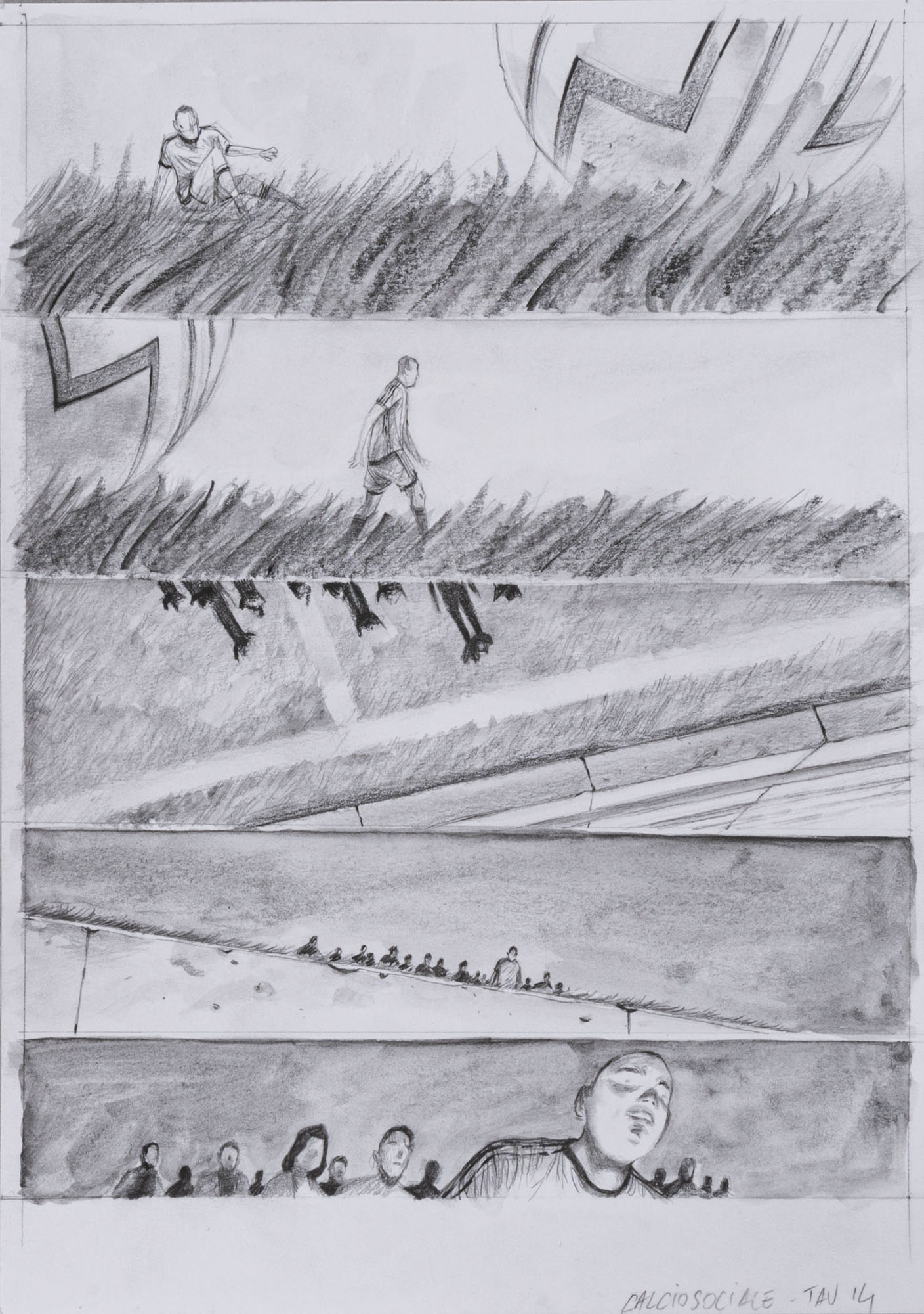 PAOLO CASTALDI(1982)Calcio Sociale, storia completa in 23 pagine con copertina2022Matita, grafite acquerellabile e pastello a olio su cartaOgni tavola misura 29,5 x 21 cmTesti di Francesca Mannocchi, pubblicato per il n. 1 de La Revue Dessinéè Italia