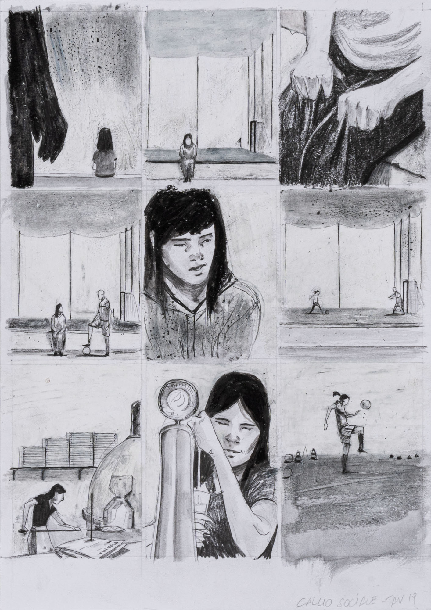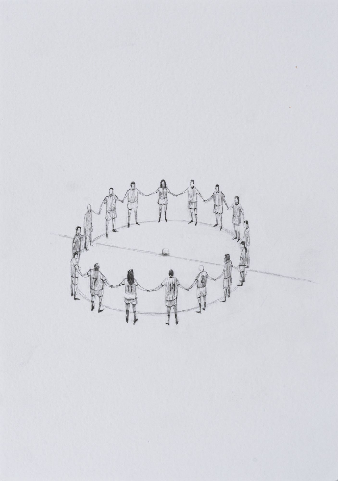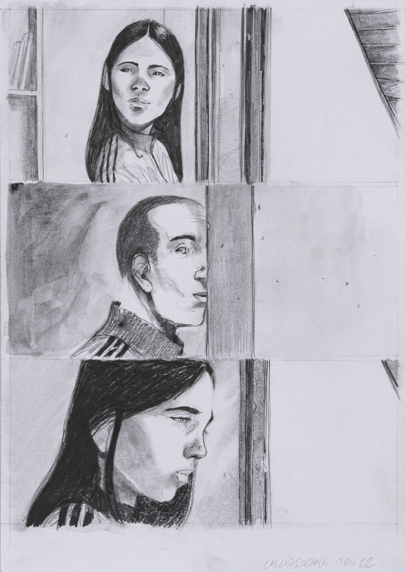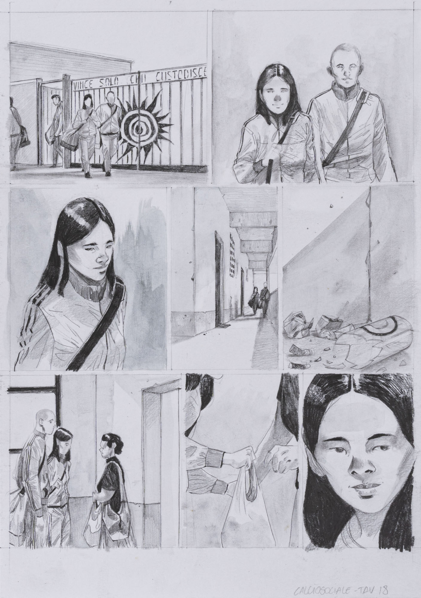 PAOLO CASTALDI(1982)Calcio Sociale, storia completa in 23 pagine con copertina2022Matita, grafite acquerellabile e pastello a olio su cartaOgni tavola misura 29,5 x 21 cmTesti di Francesca Mannocchi, pubblicato per il n. 1 de La Revue Dessinéè Italia