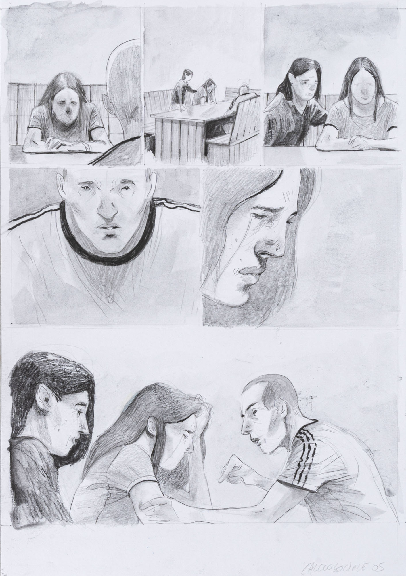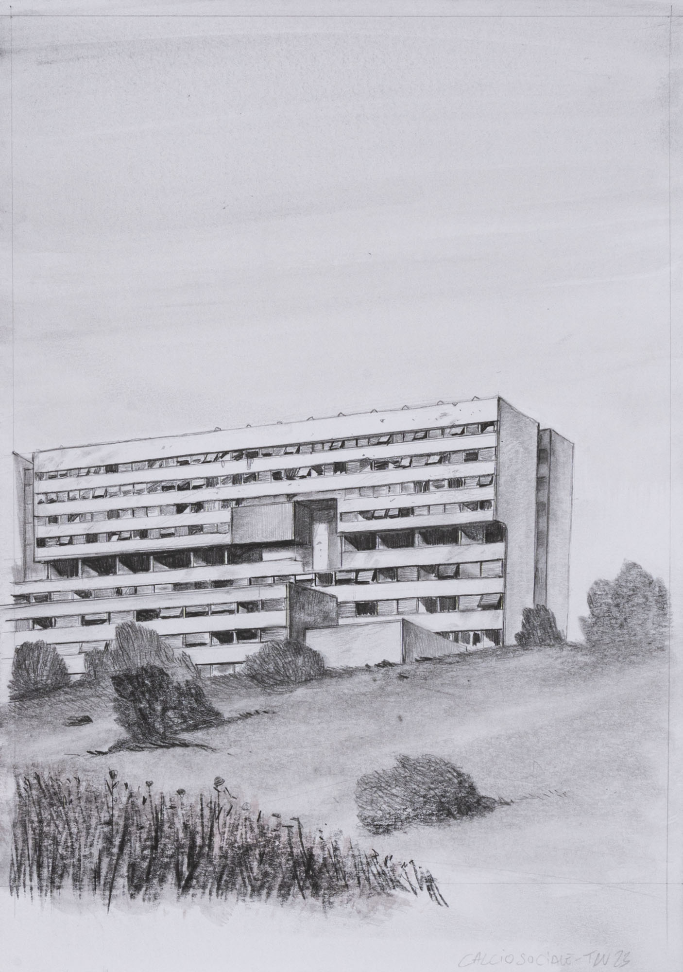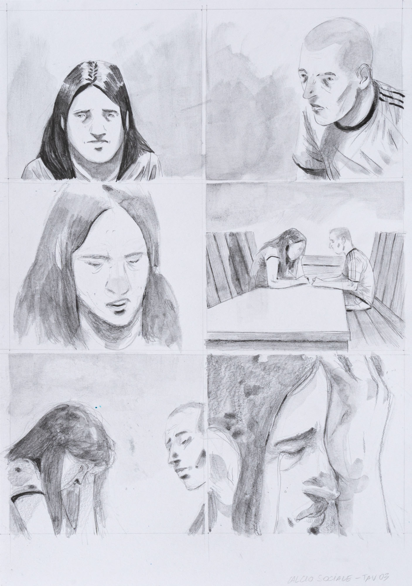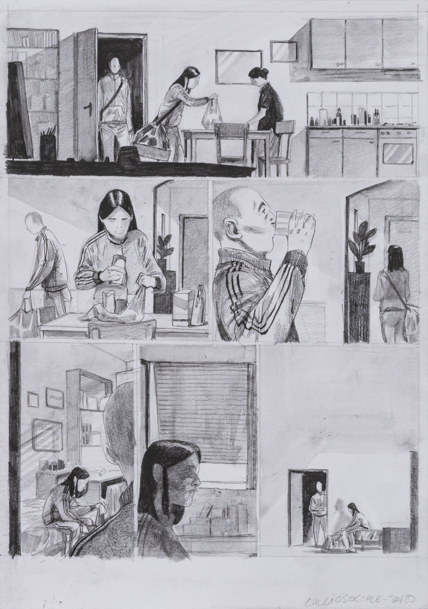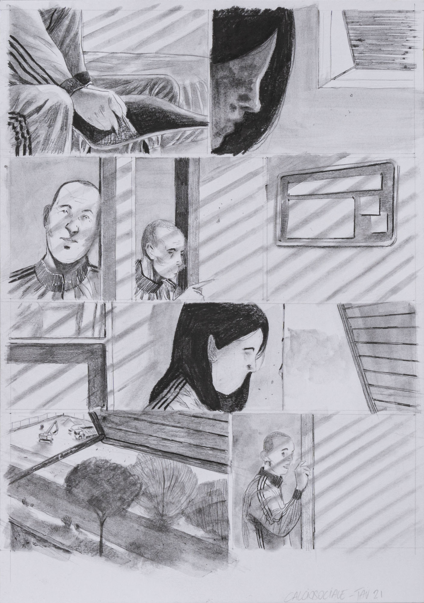 PAOLO CASTALDI(1982)Calcio Sociale, storia completa in 23 pagine con copertina2022Matita, grafite acquerellabile e pastello a olio su cartaOgni tavola misura 29,5 x 21 cmTesti di Francesca Mannocchi, pubblicato per il n. 1 de La Revue Dessinéè Italia