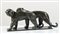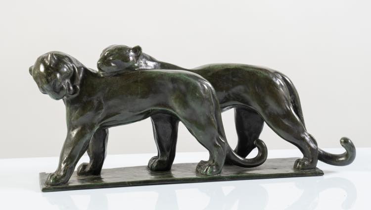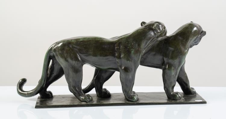 Scultura in bronzo raffigurante coppia di leonesse, circa 1930. Basamento in bronzo, patina scura con riflessi verdastri. Firma parzialmente leggibile sulla base.