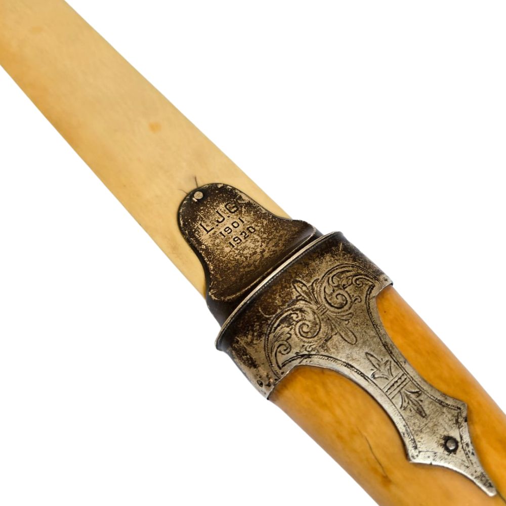 Lama e impugnatura in osso. Impugnatura decorata da lamina in metallo argentato con incise L.J.G. 1901 - 1920.
