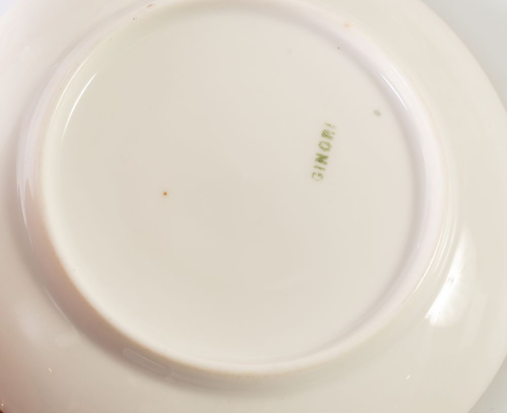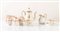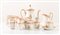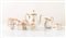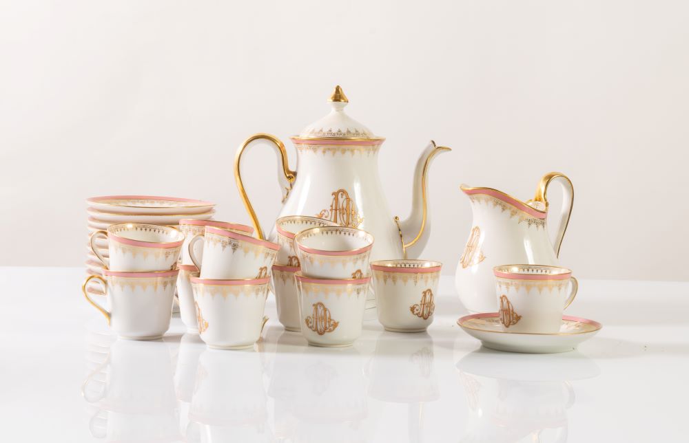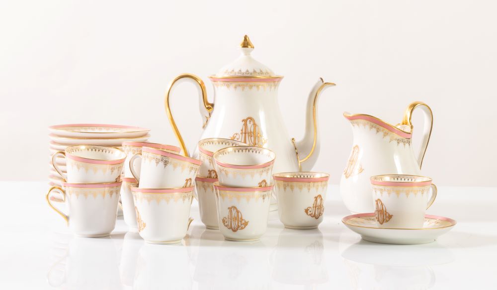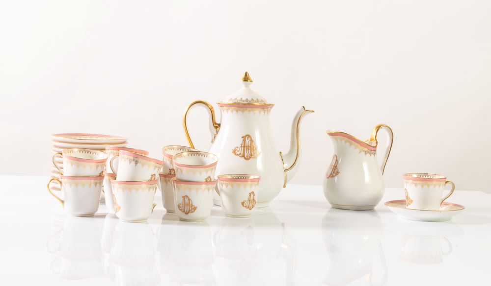 Bordo decorato esternamente da una sottile fascia rosa. Decorazioni di filettature e rifiniture in oro. Sulla circonferenza esterna decorazione di monogrammi. Servizio per 12 persone composto da caffettiera, lattiera, 12 tazzine con 12 piattini. Marchio stampato GINORI in verde.