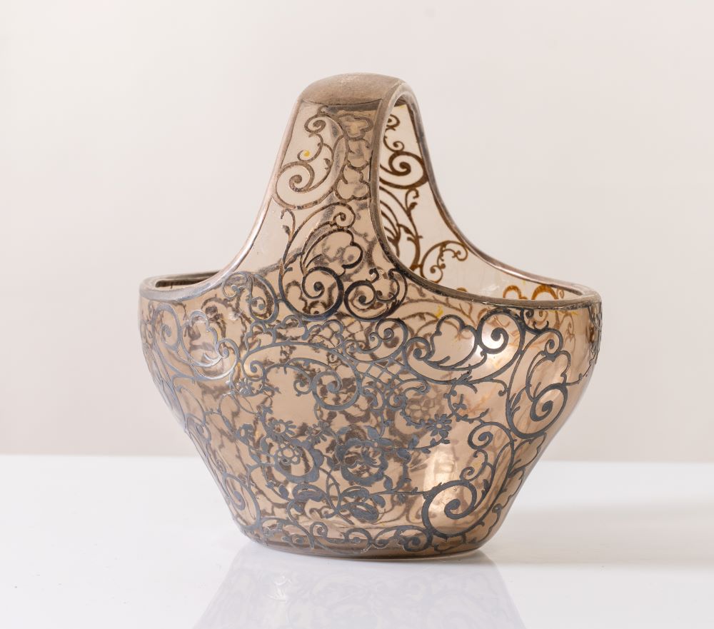 Cestina in vetro con bordi e decorazioni a rilievo in metallo argentato.