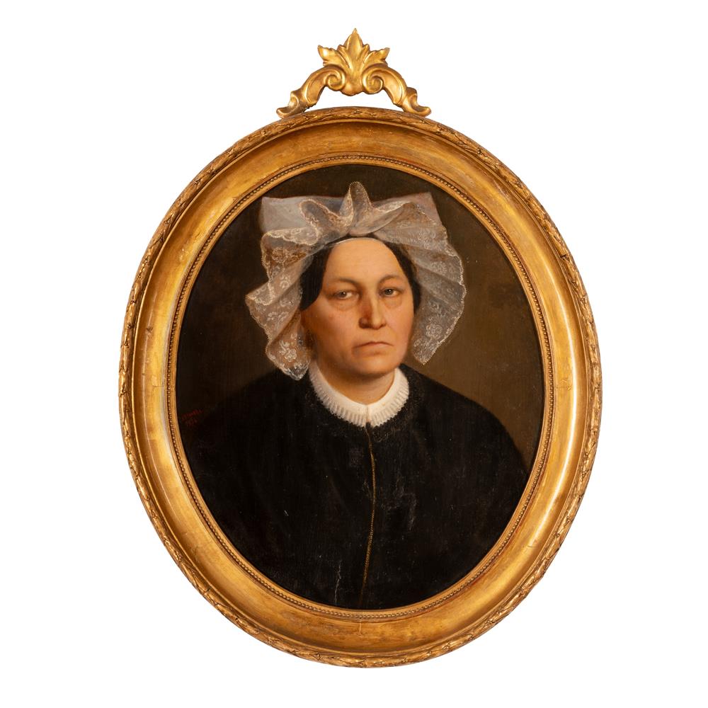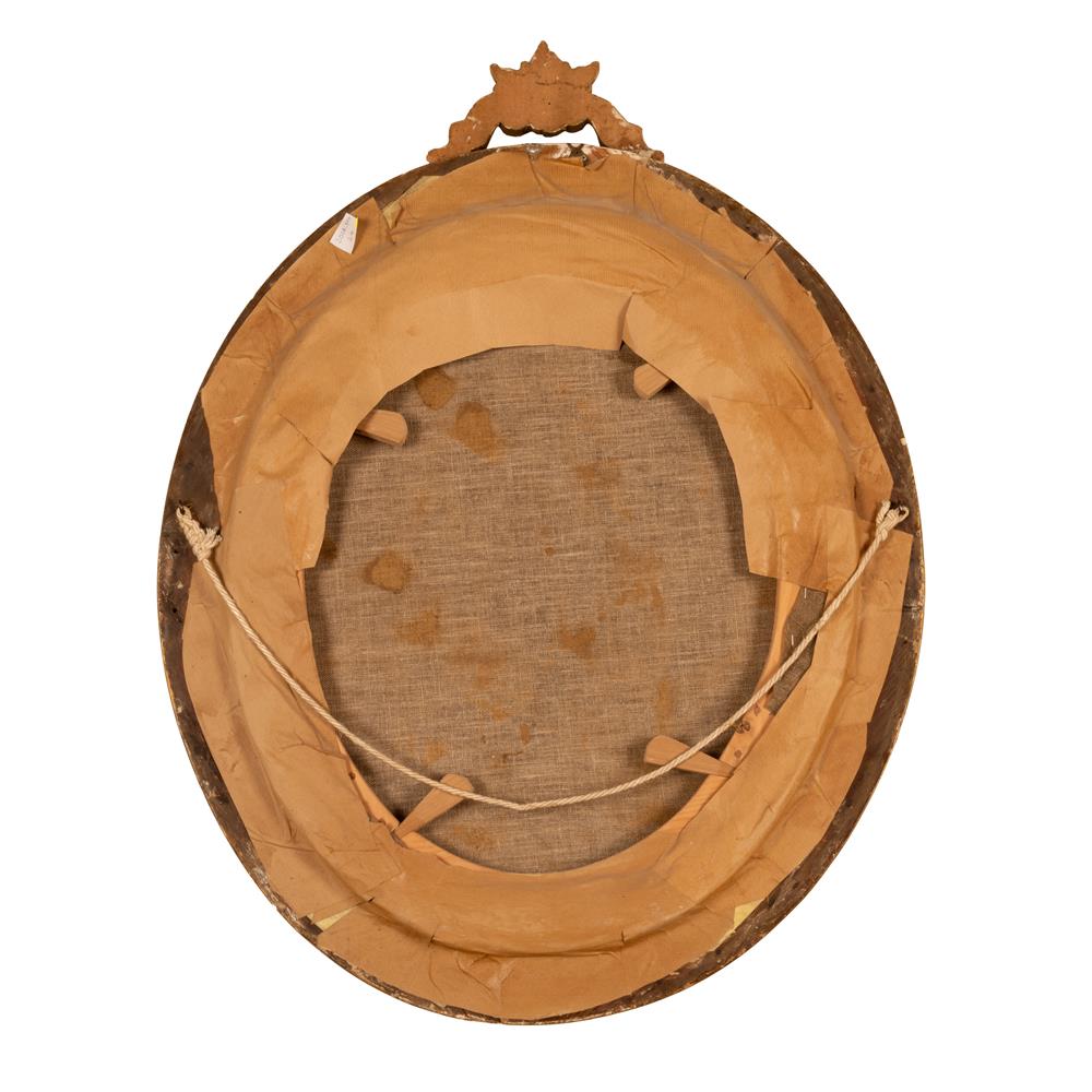 olio su tela ovale cm 63x52;: con cornice cm 90x67 Cornice dorata coeva con decoro a nastro nella parte superiore.