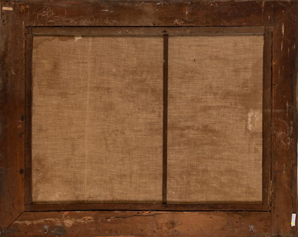 olio su tela 89x119 cm; con cornice 116x146 cm. Cornice coeva a cassetta dorata con ricchi decori a riserva e fitomorfi in nero e oro