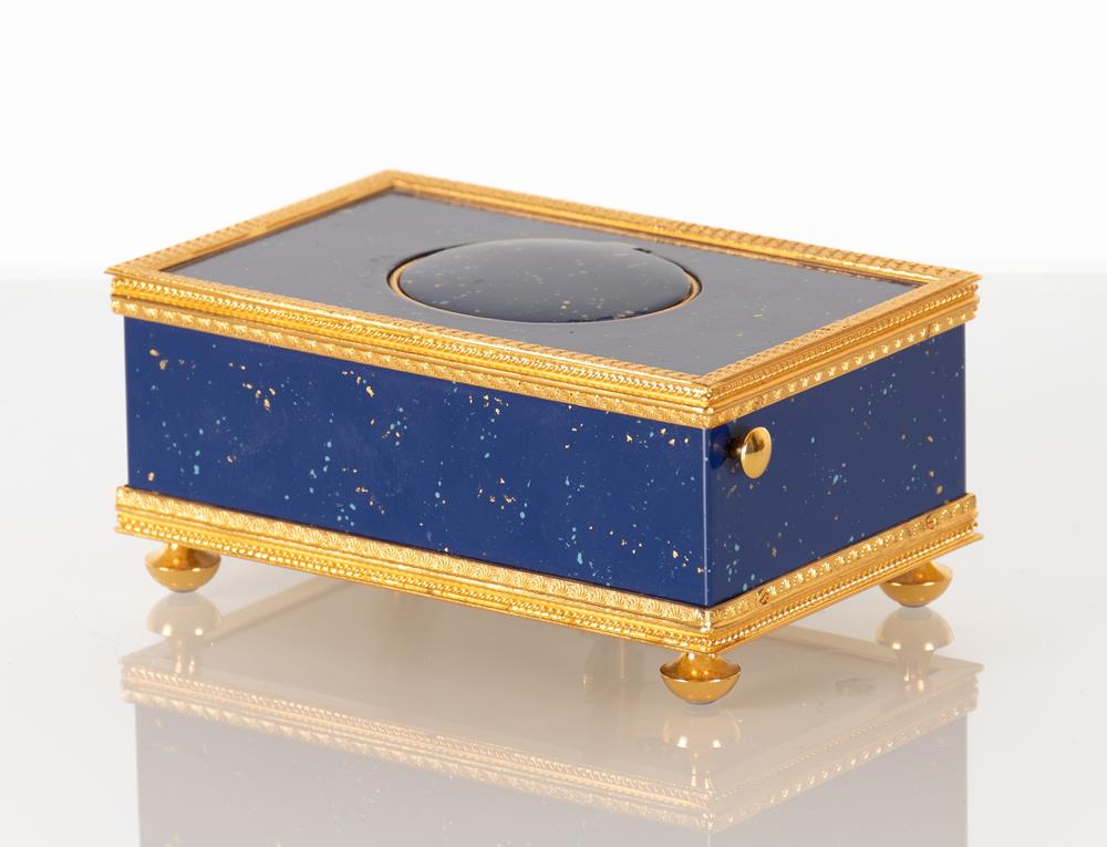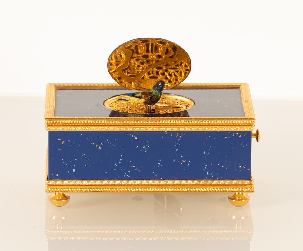 Carillon con uccellino canterino in scatola musicale di lapislazzuli creata da Reuge Music.