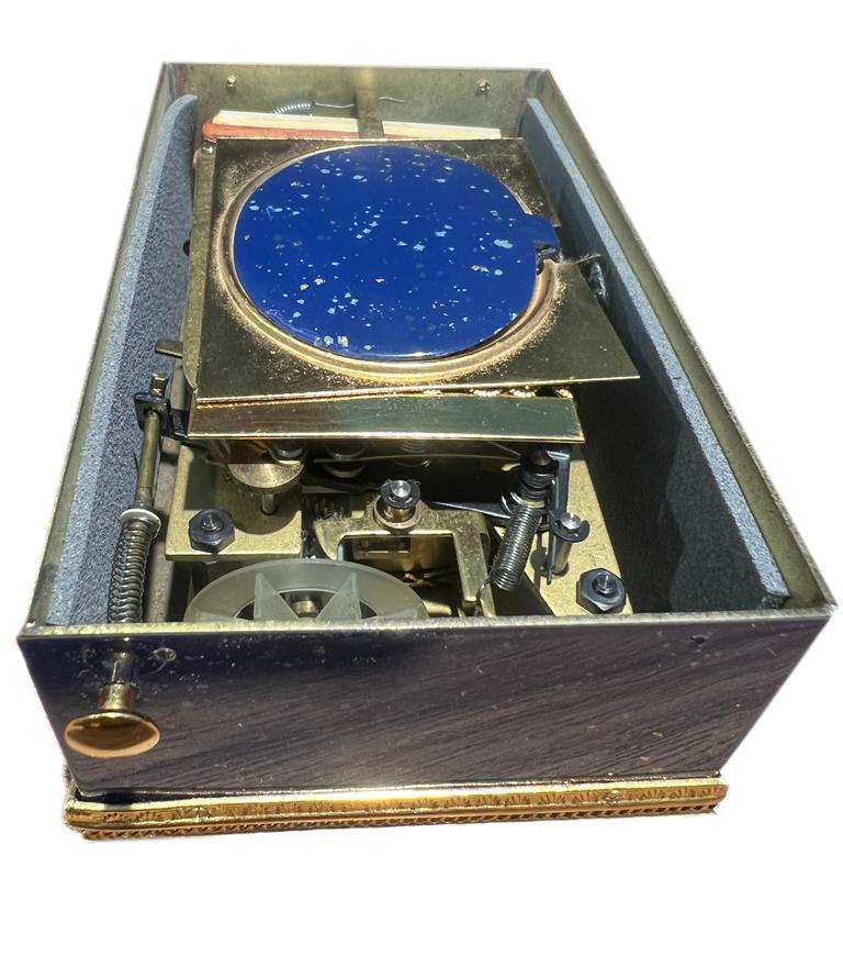 Questa scatola musicale con angoli, bordature del medaglione e piedini dorati è dotata di automa uccellino canterino creato artigianalmente negli anni '70 in Svizzera dalla Maison Reuge Music.