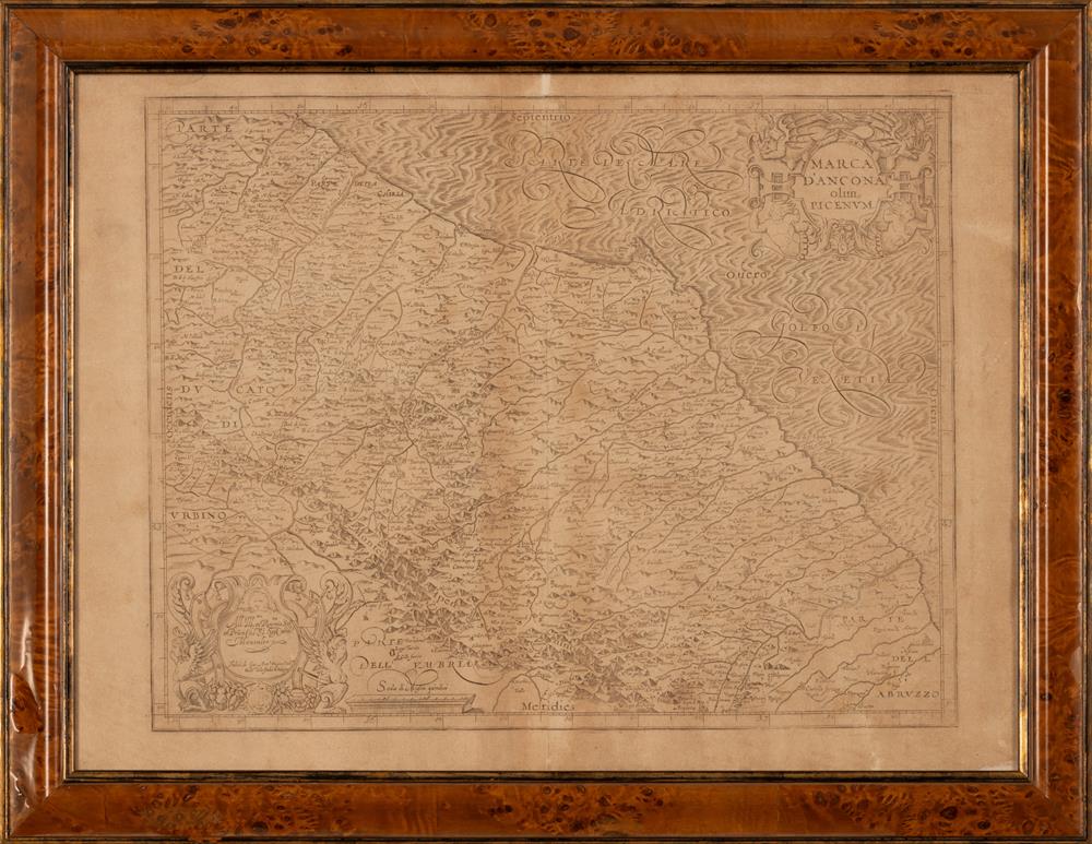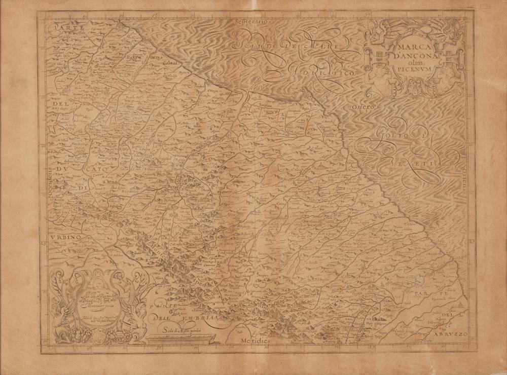 Incisione in rame. Carta geografica tratta dall'Atlante di Antonio Magini, pubblicata a Bologna dal figlio Fabio dopo la morte del padre. L’esemplare presenta due cartigli decorativi, in alto a destra e in basso a sinistra, riportanti rispettivamente il titolo della mappa e la dedica con la firma dell'autore.