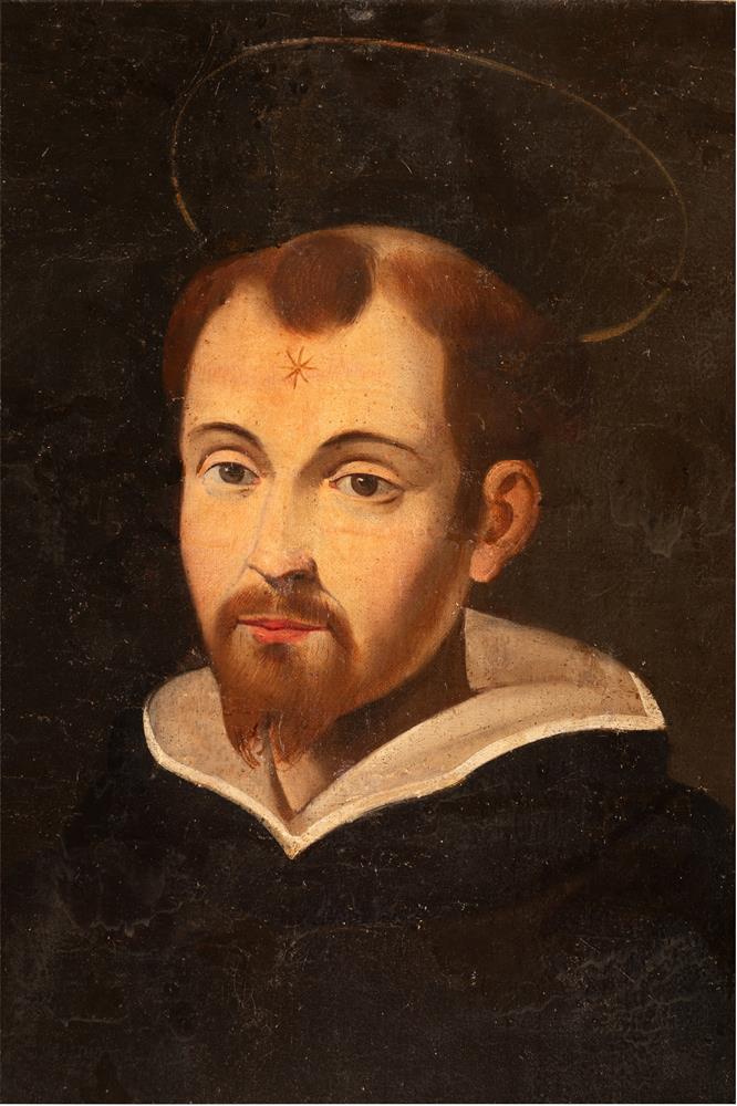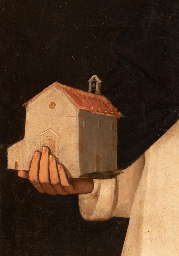 San Domenico di Guzman stante a sorreggere il modello miniaturistico della chiesa di San Domenico in L'Aquila Giulio Cesare Bedeschini (bottega di)