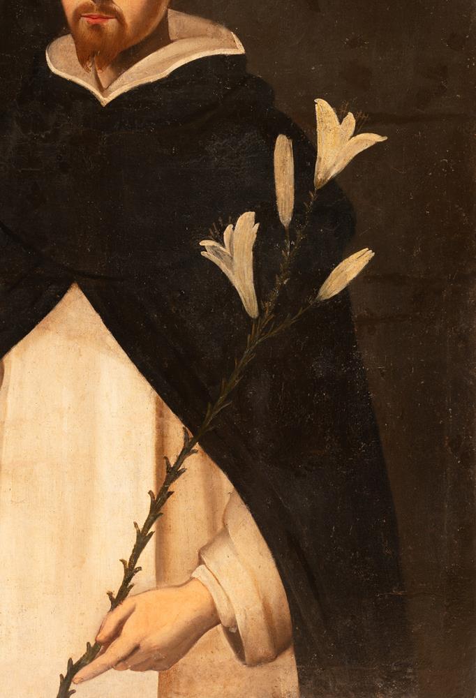 San Domenico di Guzman stante a sorreggere il modello miniaturistico della chiesa di San Domenico in L'Aquila ed un serto di un giglio bianco fiorio, quali suoi canonici attributi