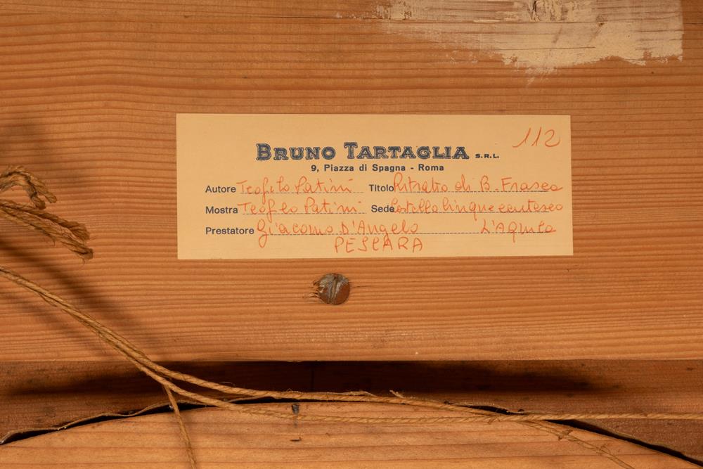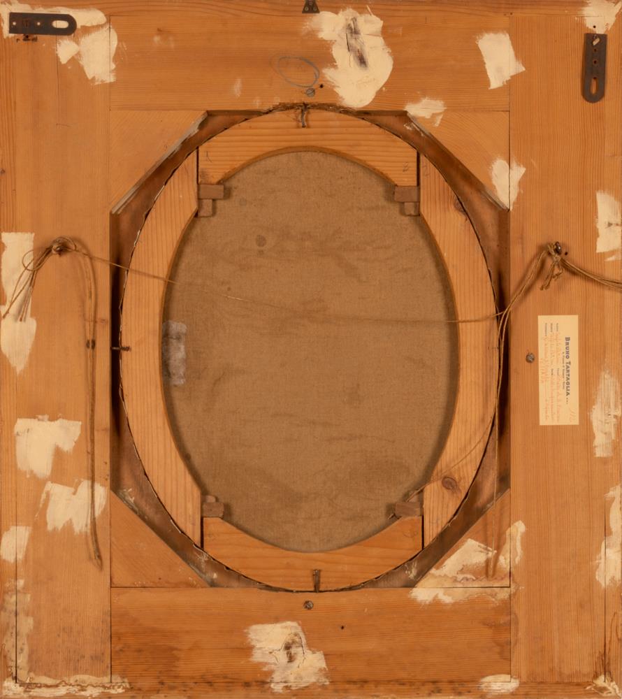 Cornice coeva con decori di frutti a rilievo. Al retro talloncino con dicitura del noto trasportatore di opere d'arte Bruno Tartaglia, con sede al civico 9 di Piazza di Spagna a Roma attestante la presenza del dipinto ( al n. 112) nella Mostra tenuta nel Castello Cinquecentesco di L'Aquila ed indicante quale prestatore il giornalista e scrittore Giacomo D'Angelo di Pescara.