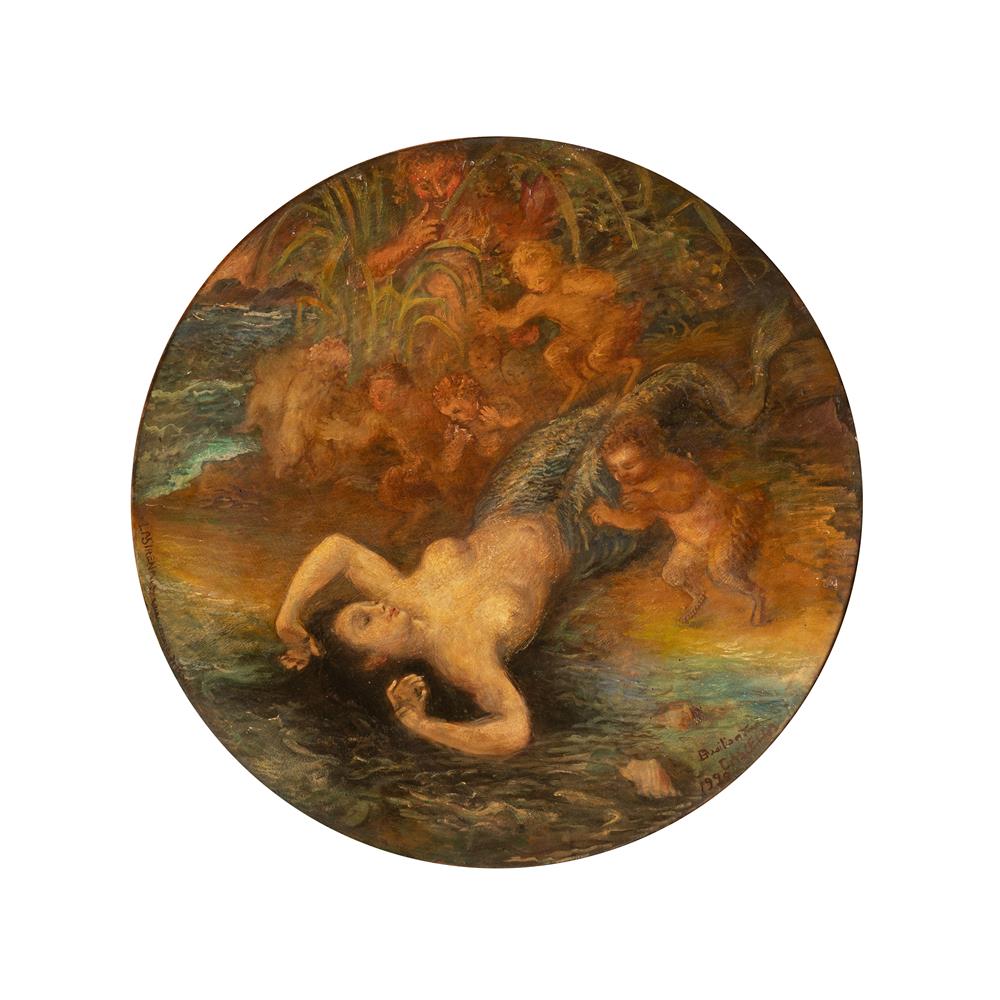Firmata in basso a destra "Basilio e Tommaso Cascella 1920". Reca un'iscrizione sul lato sinistro in italiano e vernacolo abruzzese "la sirena distesa coccia cape na balle".