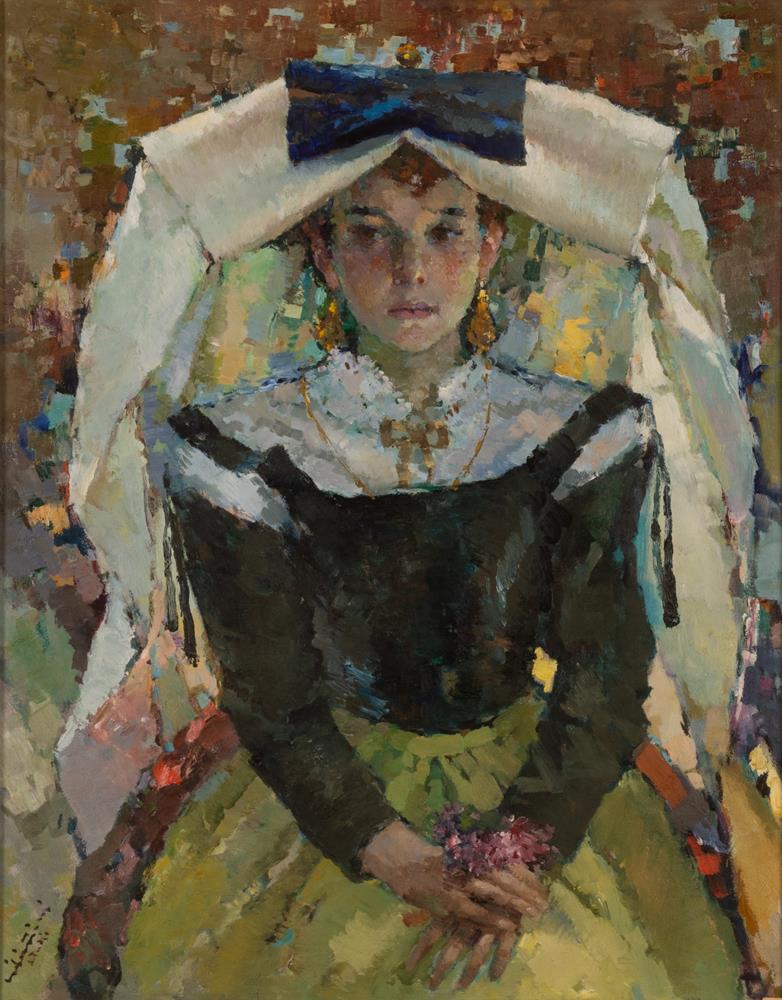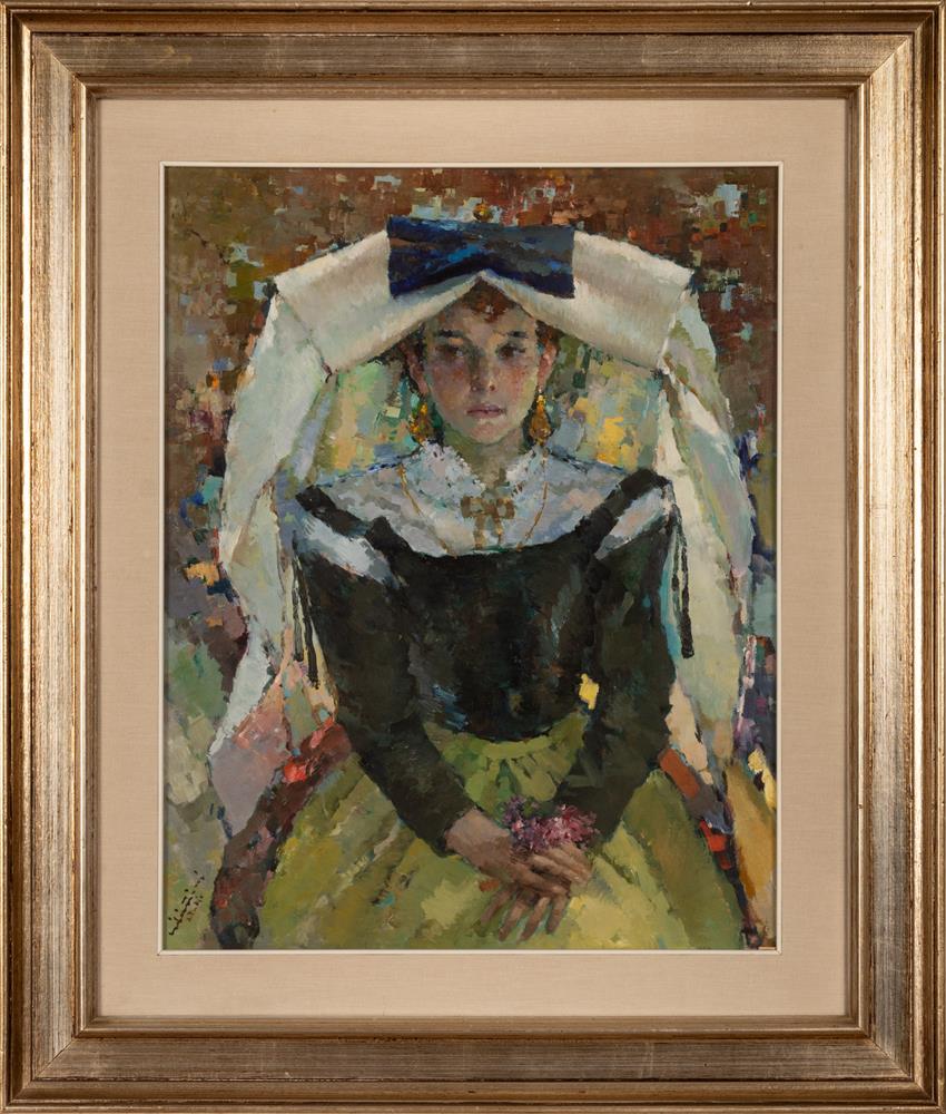 Studio di una giovane donna di Scanno con abiti e ori tradizionali