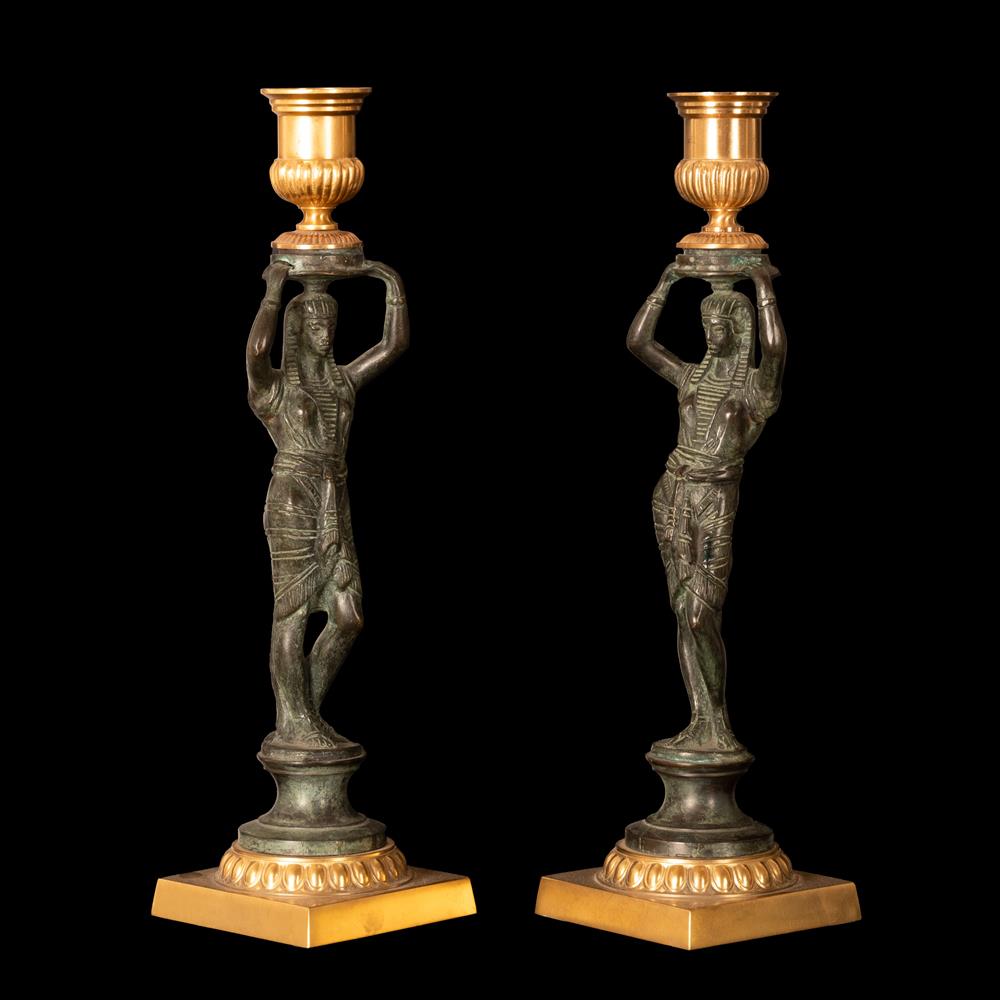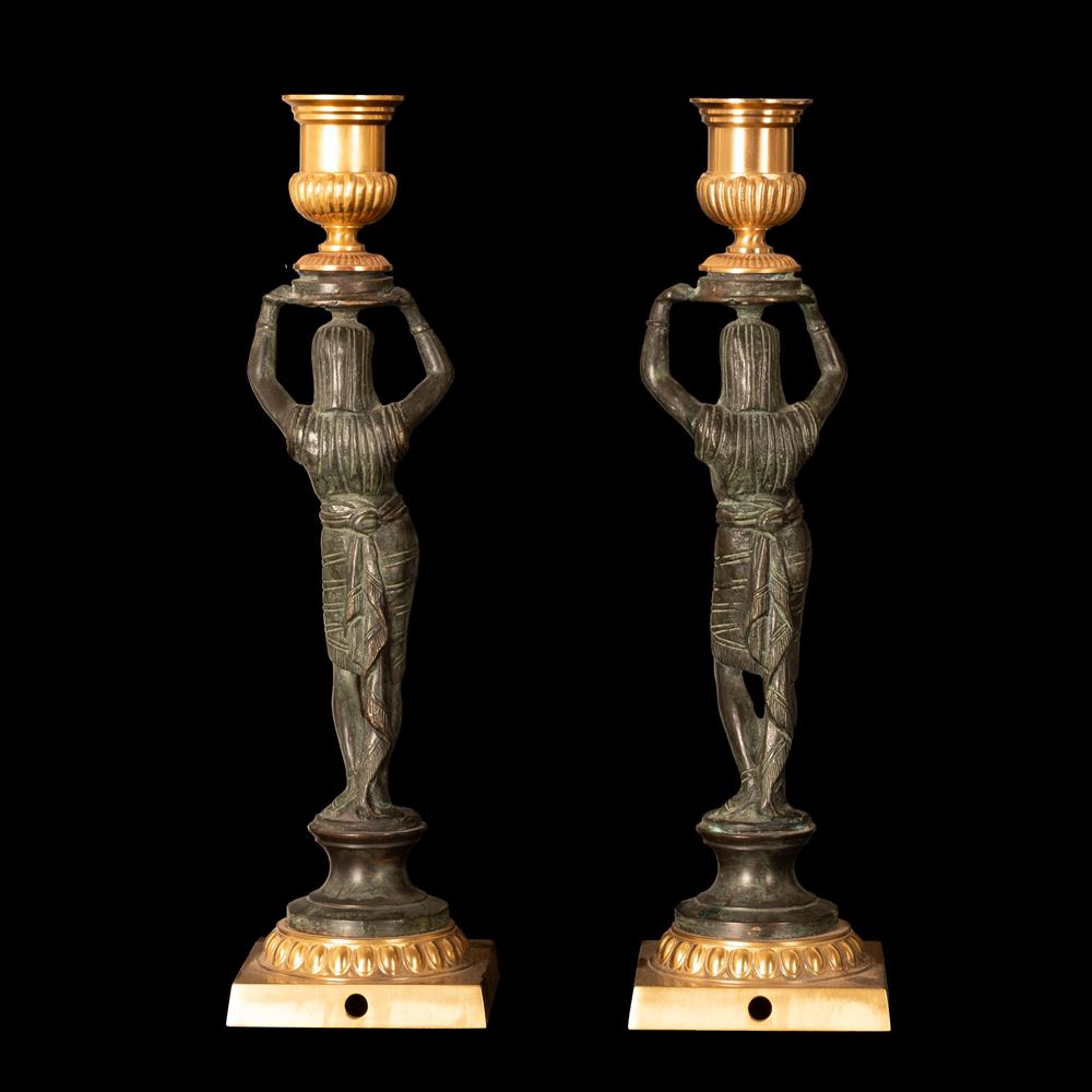 Coppia di candelabri Grand Tour in bronzo brunito e bronzo dorato, raffiguranti ancelle egizie stanti a sorreggere grandi vasi.