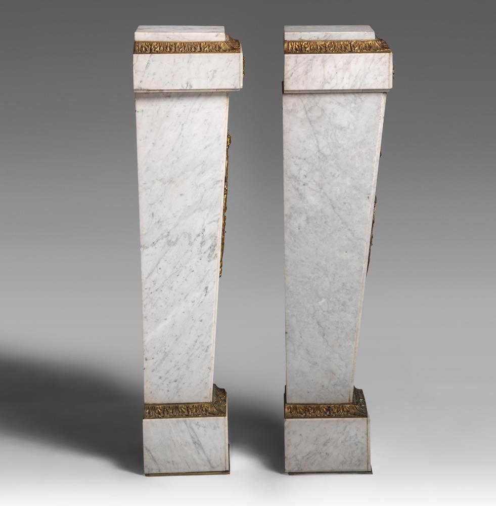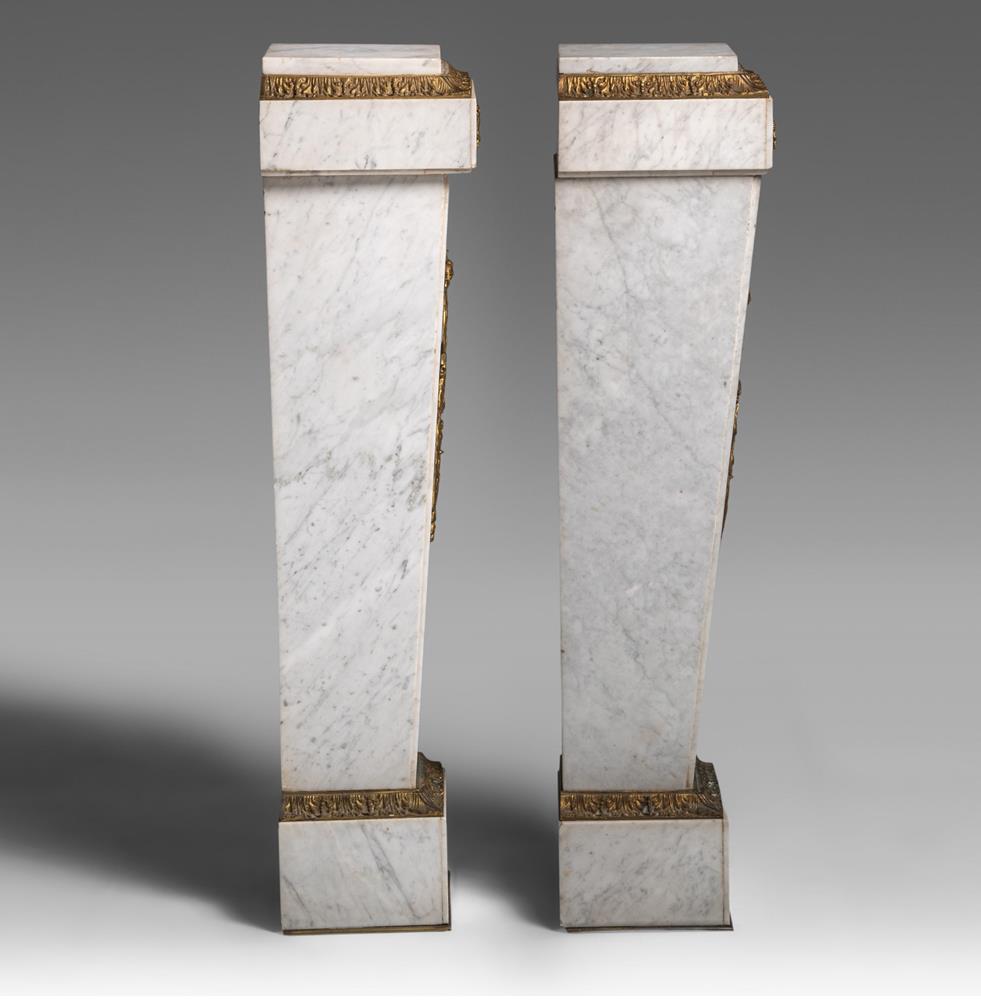 Coppia di erme placcate in marmo di Carrara con fregi in bronzo dorato. fine del XIX - inizi del XX secolo