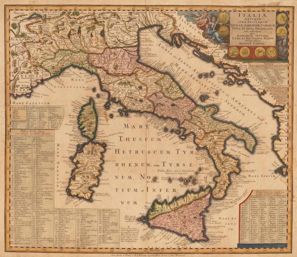 ITALIAE ANTIQUE ITEM INSULARUM SICILIAE, SARDINIAE, CORSICAE, TYPUS ET NOVA DELINEATIO, AERI INSCULPTA PER MATTHAEM SEUTTER S. CAES. ET REG. CATHOL. MAJEST. GEOGRAPHUM AUGUSTAE VINDELC. 1750