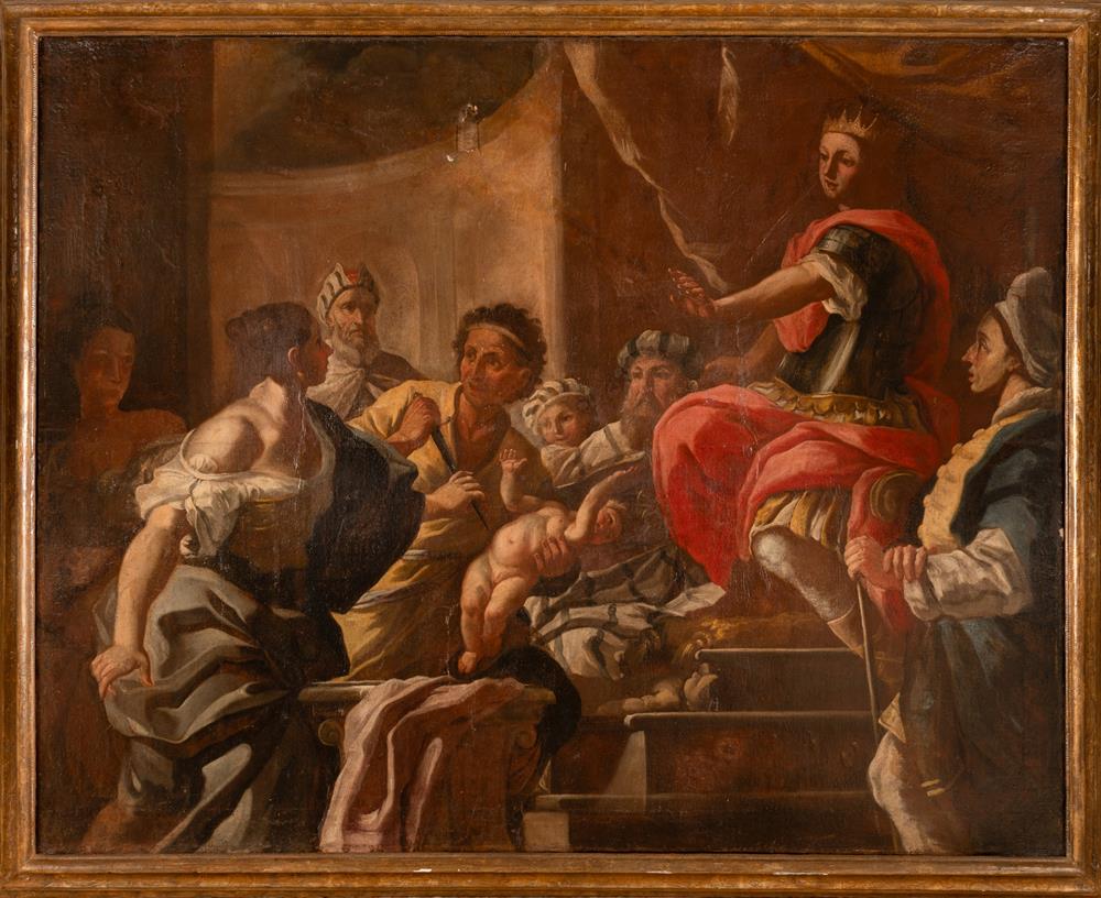 cm 156x196; con cornice cm 174x214 l dipinto raffigura l'episodio biblico del Giudizio di re Salomone (I Re, 3, 16-28). Lo stile, le tonalità del colore e la tipologia dei protagonisti, indicano l'origine partenopea del dipinto e lo collocano in un arco di tempo tra il primo e il secondo quarto del XVIII secolo