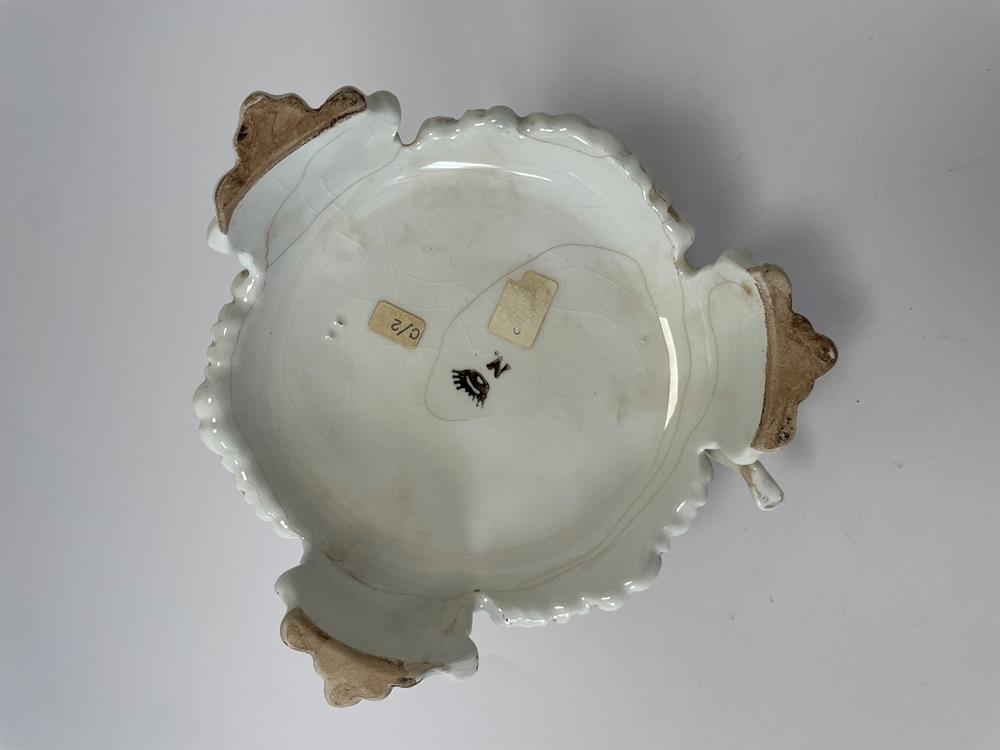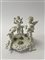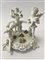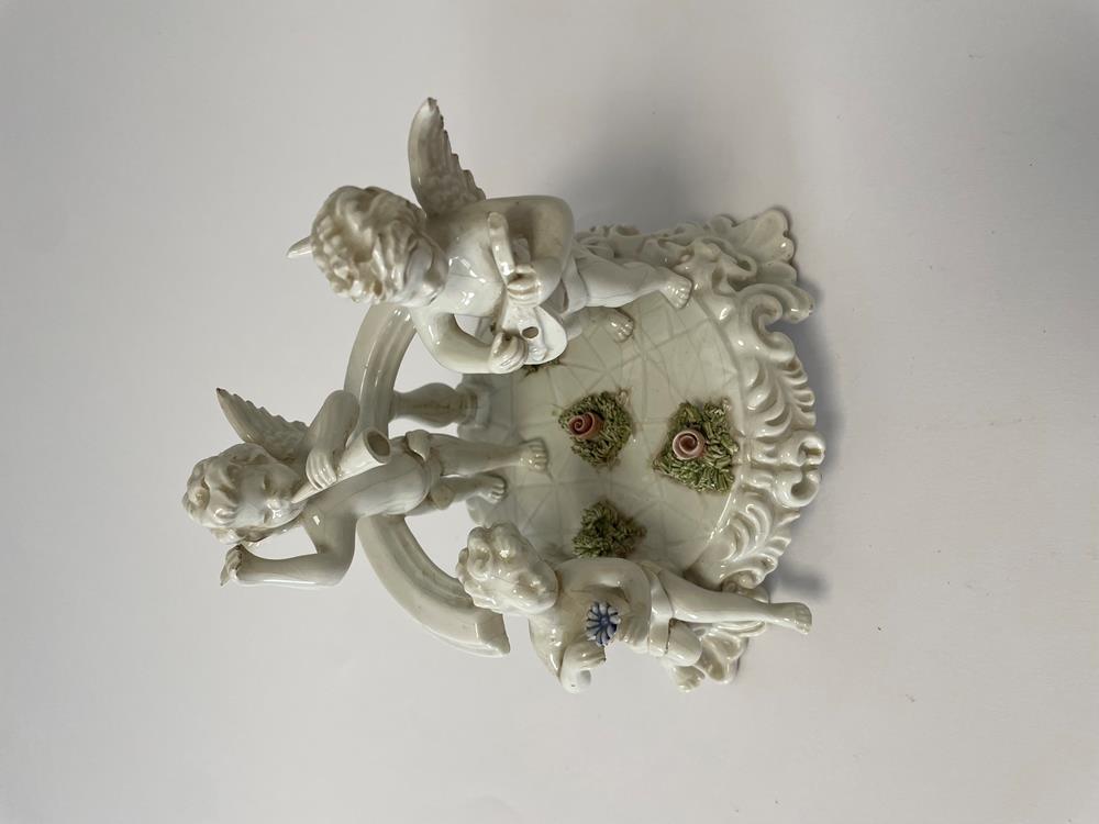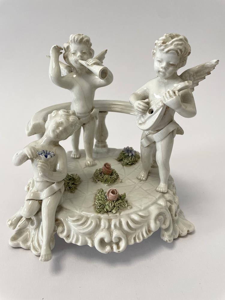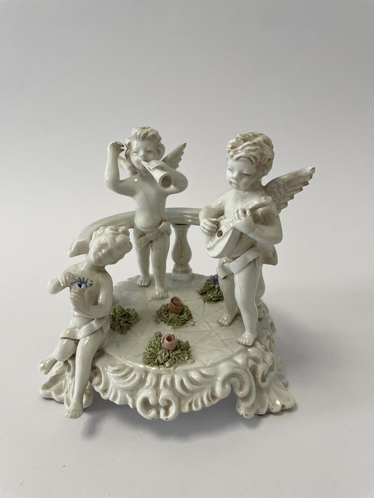 Composizione in porcellana bianca con inserti policromi di fiori raffigurante tre putti che suonano, uno la tromba, l'altro il mandolo e uno con fiore in mano, poggianti su una ringhiera. anni Venti del XX secolo