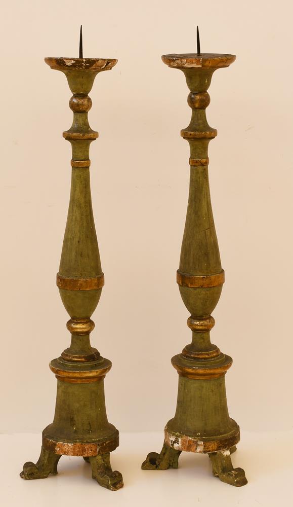 Lotto 264 | Coppia di torciere in stile neoclassico da altare in legno laccato verde e dorato.