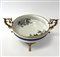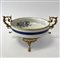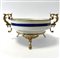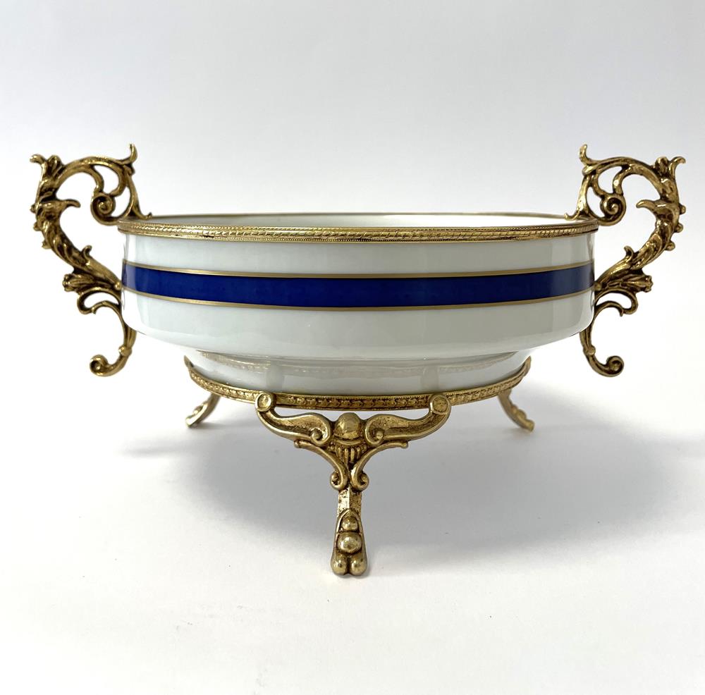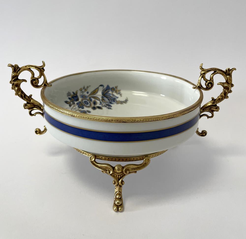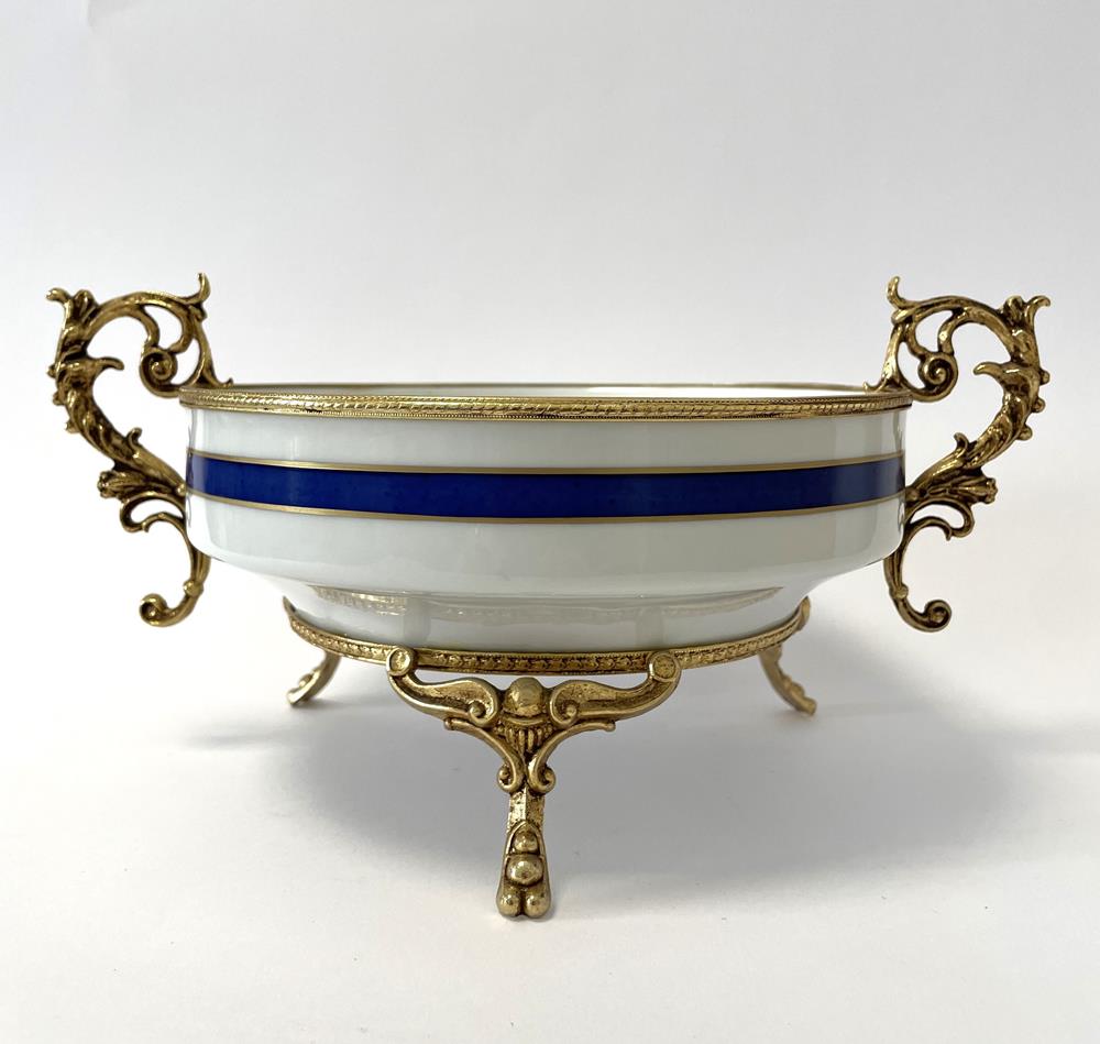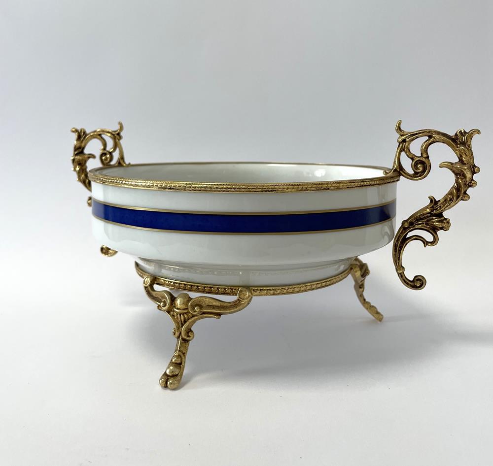 Ciotola con manici in ceramica Limoges nei toni del bianco blu e oro con inserti in bronzo dorato