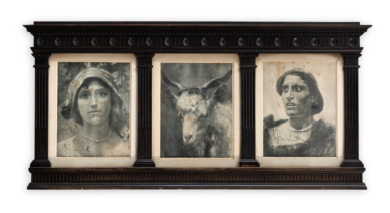3 riproduzioni fotolitografiche di Francesco Paolo Michetti entro unica cornice recanti firma dell'Artista a china al fronte