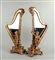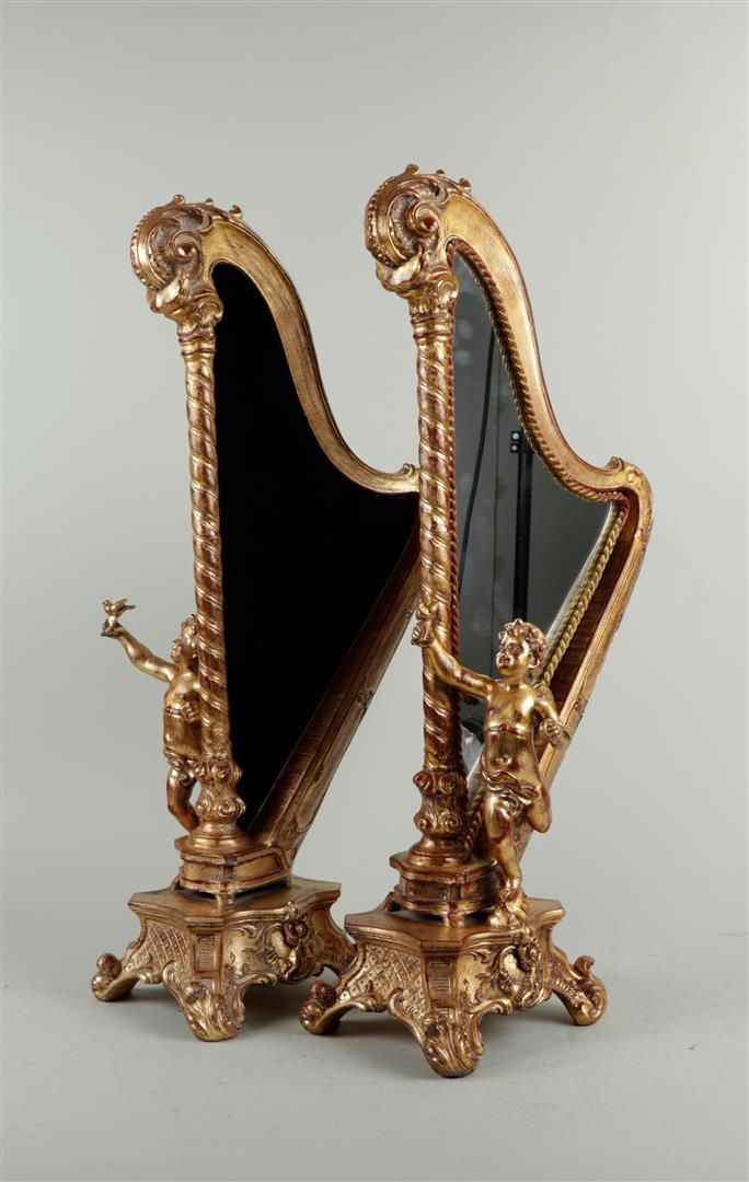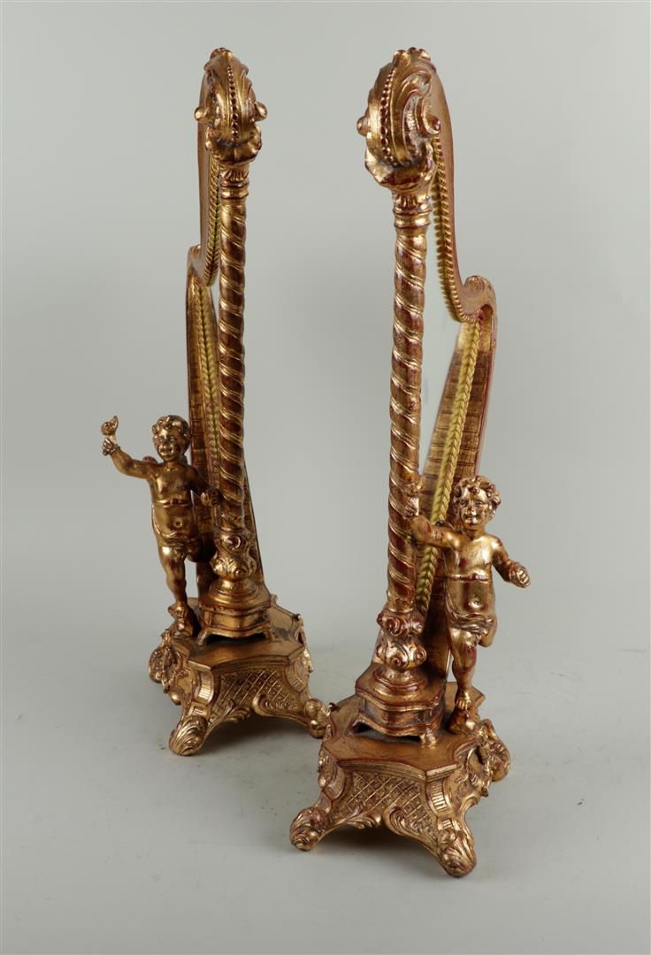 Lotto 77 | A set of two decorative harp-shaped mantel mirrors with puti. H. 62 cm.