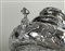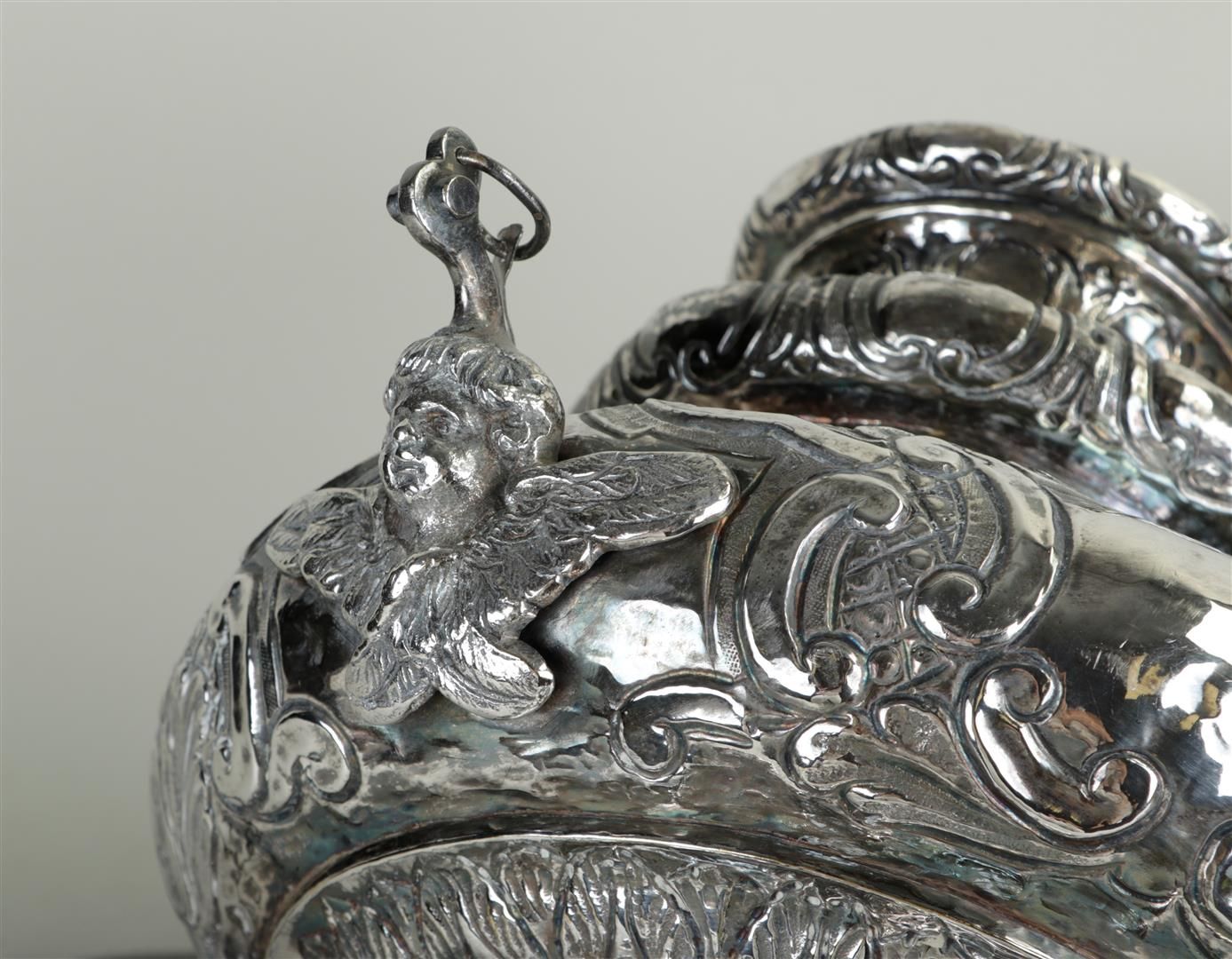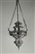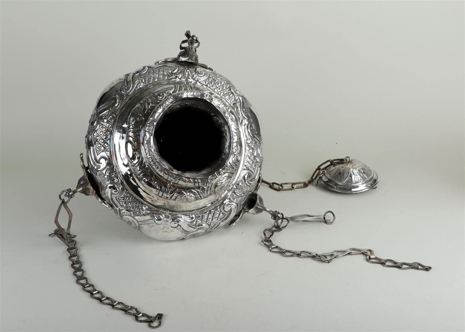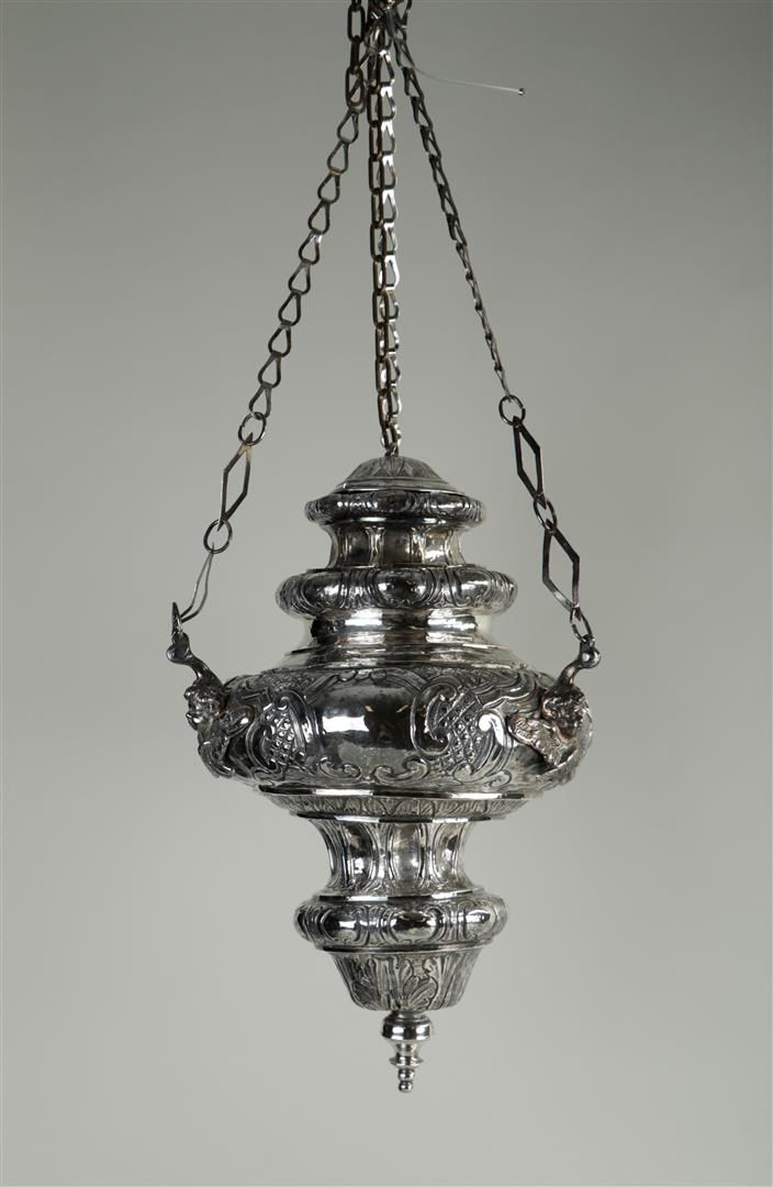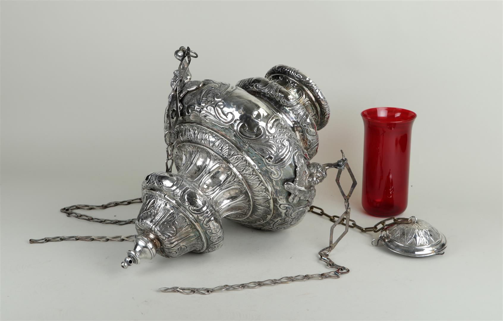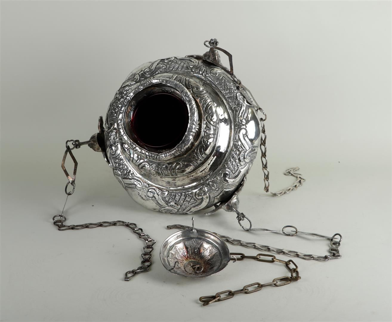 A chased silver sanctuary lamp with matching red glass candle holder, on...