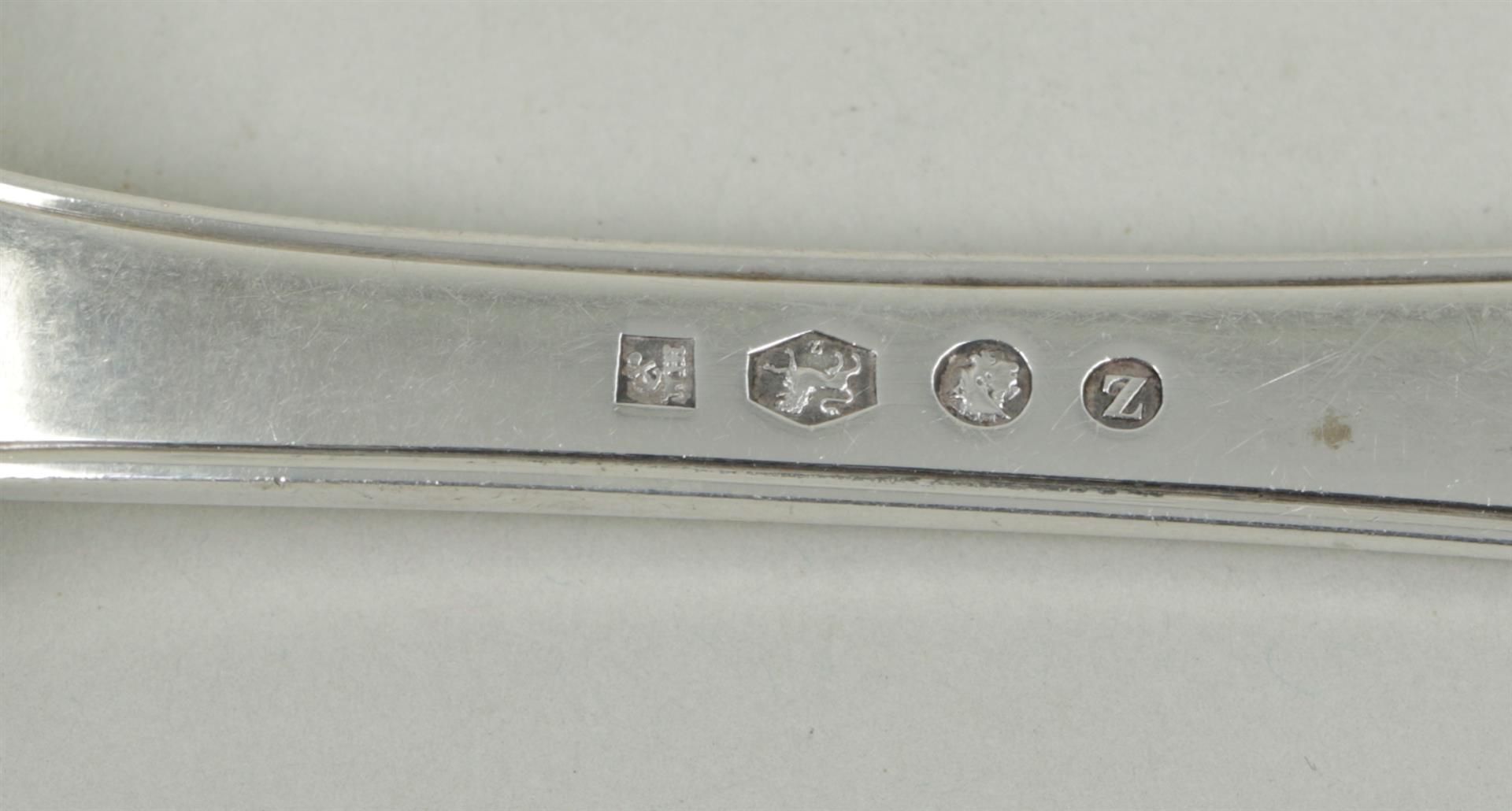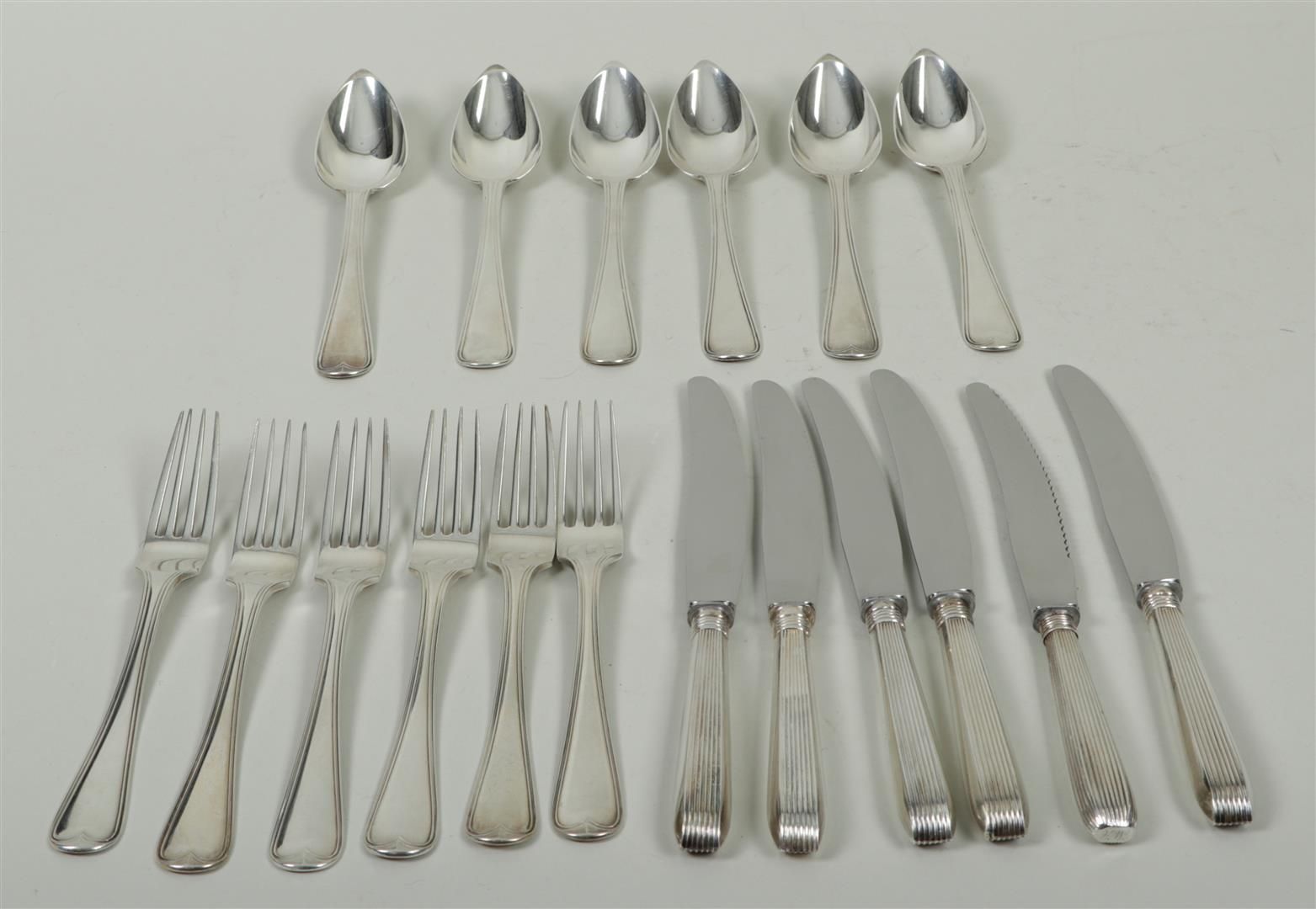 A silver cutlery set for six consisting of a fork, a knife, and a spoon. 19th...