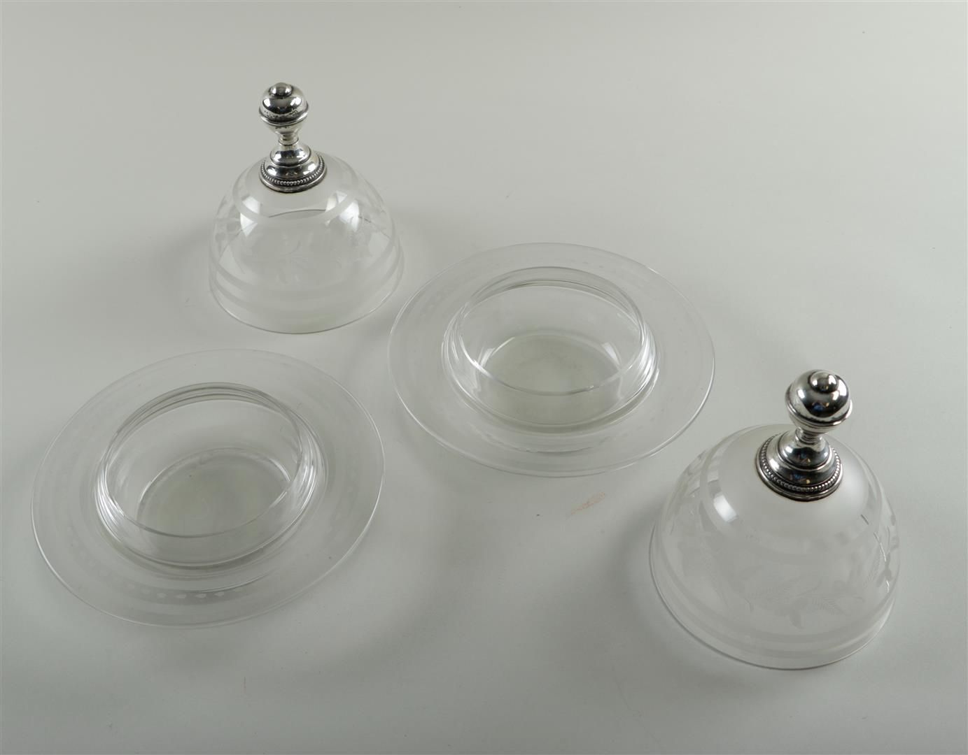 A pair of etched glass domes with silver knob.