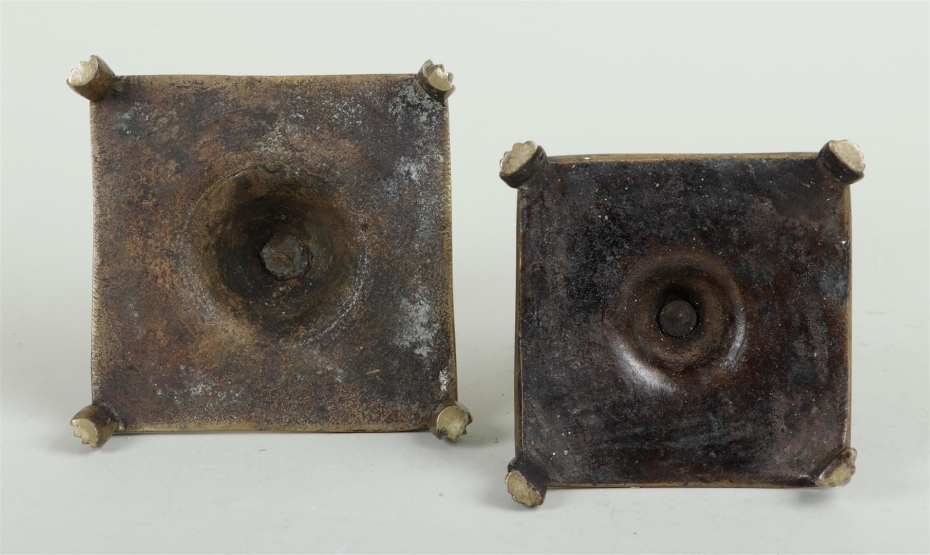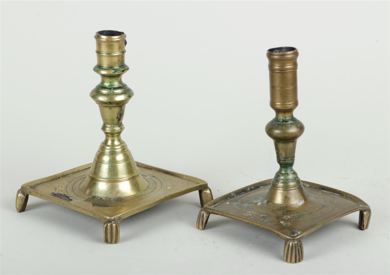 A lot of two Spanish brass candlesticks on a square base and legs, 17th/18th century.